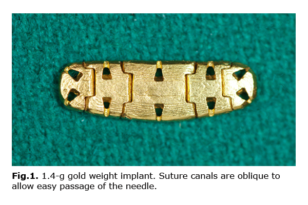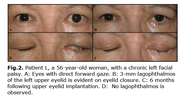 Over the last decade, we have operated on about 400 patients with PL at the Research Institute of Eye Diseases. At the beginning of that period, we used different tarsorrhaphy techniques combined with ectropion repair or radial suture passage, or upper eyelid retraction repair. Additionally, some patients underwent suture midface lift. In more recent years, gold weight implantation has become our procedure of choice for managing PL. Thus, in 60 patients, the implantation of the gold weight developed by the authors was the only method used for the correction of PL. At the 6 month follow-up, the lagophthalmos and palpebral fissure narrowing in down gaze in these patients were found to be significantly (p<0.05) reduced from 5.44±2.62 mm to 0.24±0.71 mm, and from 4.57 mm to 1.39 mm, respectively, with the mean decrease in upper eyelid position of 1.88 mm (Fig. 2). Therefore, gold weight implantation provided reduction in or elimination of lagophthalmos, improvement in the biomechanics of the upper eyelid, and had a low complication rate.