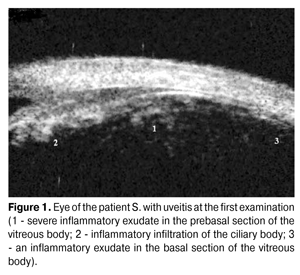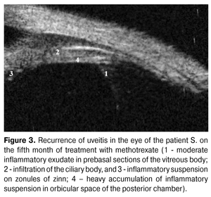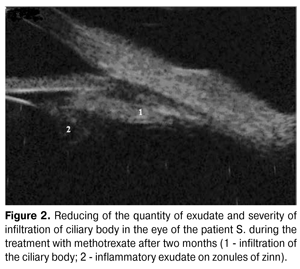 Two months later, on the background of the treatment with methotrexate (Fig. 2) the quantity of inflammatory exudate and severity of infiltration of the ciliary body have decreased, but there was moderate accumulation of fine divided inflammatory suspended matter in the basal sections of the vitreous body and some exudate which persisted on zonule of zinn. At this a complete remission of uveitis has not been reached. According to the data described by Chylack LT [5], the lack of effect of topical steroids is recorded within 6 months from the beginning of their use in almost 1/3 of the patients, which is evidenced in our clinical case. Reports about methotrexate suggest that its prescription does not provide complete control of inflammation; it does not reduce the need for systemic and topical steroids, and does not reduce the frequency of relapses of uveitis in about a half of patients with uveitis on the background of JA [10].