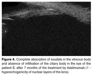 Considering the presence of relapse during the treatment with methotrexate, in five months Adalimumab 20 mg 1 time in two weeks subcutaneously was prescribed additionally. The patient S. already on the second week of treatment showed clinical improvement: morning stiffness has disappeared, range of motion in the joints significantly increased. During the control ophthalmological study there was noted disappearance of the circumcorneal flush and photophobia, precipitates on endothelium of the cornea have reabsorbed. According to UBM in 4 months exudate in prebasal sections of the vitreous body has reabsorbed and its quantity in basal sections has decreased. Against the background of this therapy a complete relief of inflammatory process and significant improvement in visual acuity has been achieved. After 7 months of the usage of Adalimumab an exudate in basal and prebasal sections of the vitreous body has reabsorbed completely (Fig. 4), inflammatory infiltration of the ciliary body was not observed.