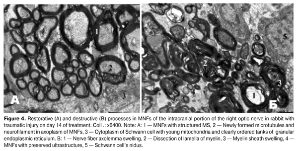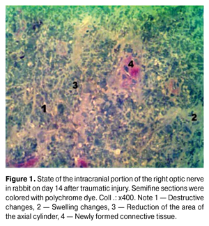 According to morphological studies on light-optical level of the intracranial portion of the optic nerve of rabbits from injured group on the 14th day (Fig. 1), significant swelling and destructive changes of the sheaths of myelinated nerve fibers (MNF) were observed, which led to a reduction of axial cylinders that were not detected in some nerve fibers, and the myelin sheath (MS) of these fibers occupied almost the entire area of the fiber. In endo- and perineurium the proliferation of connective tissue by newly formed collagen fibers was observed.