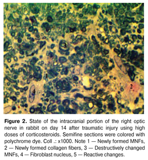 Purpose: to study morphological aspects of restorative processes in the optic nerve after traumatic injury under the influence of high doses of corticosteroids.