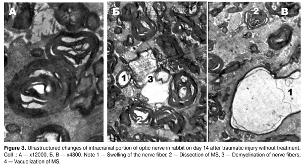 In 2 weeks, a part of animals (6) from the both groups was withdrawn from the experiment via the guillotine. For morphological confirmation of damage, cranial portion of the optic nerve in both eyes was observed using light and electron microscopes. The corresponding structures of the control group were used as control ones.