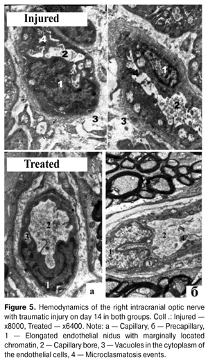According to morphometry, a decrease in MNF area (p = 0.006972) alongside with a statistically significant increase in the g index (p = 0.000423) in intracranial portion of the right optic nerve, has been observed in the treated group compared to the injured one, indicating active processes of remyelination of these fibers.