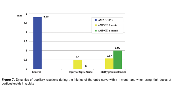 Consequently, it has been established that the use of high doses of corticosteroids after the traumatic injury of the optic nerve contributes to the appearance not only of morphological but also of functional features of recovery processes activation in the optic nerve.