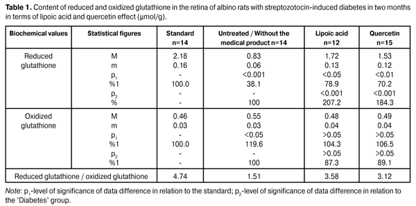In six months of the diabetes progress in terms of lipoic acid application the oxidized glutathione content in the retina has increased up to (1.62±0.14) µmol/g, i.e. it has increased by 134.8% (p <0.001) compared to an ‘untreated’ group (0.69 ± 0.04) µmol/g. In terms of quercetin effect the reduced glutathione content has increased by 113.0%, which amounted to (1.47±0.13) µmol/g with respect to the group animals that did not receive the medical product (р<0.001). The reduced glutathione content in the diabetic untreated animals group has reduced to 68.3% with respect to the standard of (2.18 ± 0.16) µmol/g. The oxidized glutathione content in the retina in terms of experimental diabetes progress and lipoic acid application was reduced to (0.47 ± 0.03) µmol/g, i.e. it amounted to 81.0% with respect to the untreated group of diabetic animals (0.58 ± 0.04) µmol/g (p<0.05). In the group of diabetic animals in terms of quercetin application the content of oxidized glutathione has decreased by 13.8%, i.e. (0.50 ± 0.04) µmol/g, compared to the ‘untreated’ group. The oxidized glutathione content in terms of diabetes without the medical product application has increased by 26.1% compared to the standard of (0.46 ± 0.03) µmol/g. Analysis of the research being conducted on our part shows a sharp decline in the glutathione system reduction potential, primarily due to a sharp reduction of the coenzyme reduced form level. Thus, the concentration of reduced glutathione form in two months of the diabetes progress has reduced by 61.9%, and in six months – by 68.3% without the medical product application. The obtained data provide grounds to believe that the main metabolic targets, on which it is necessary to focus while developing the diabetic retinal lesions prevention and treatment methods, are the following: the antioxidant system potential reduction, in particular, the reduced glutathione concentration reduction that contributes to the lipid peroxidation products accumulation in the retina and the retinal pigment epithelium intracellular membranes disintegration (lysosomes labilization). In our opinion, the glutathione levels normalization should contribute to the methylglyoxal neutralization in glyoxalase reaction with the use of glutathione. Also, the glutathione system potential normalization activates the free radical compounds quenching processes due to the reduced glutathione form. On the basis of the above, we have conducted research in order to identify the possibility of described metabolic processes correction by means of lipoic acid and quercetin medical products. Lipoic acid and quercetin application allowed to increase the reduced glutathione level by 107.2 and 84.3% in two months of the research and by 134.8 and 113.0% in six months of the diabetes progress as compared to the untreated animal group. It is noteworthy that lipoic acid has a more distinct normalizing effect on the retinal reduced glutathione concentration. Conclusions 1.In terms of streptozotocin-induced diabetes progress the decrease of coenzyme (reduced) glutathione form by 61.9% (in 2 months) and by 68.3% (in 6 months) was determined. 2.Lipoic acid and quercetin medical products administration had a normalizing effect on the retinal metabolism, which is manifested in the reduced glutathione levels increasing by 107.2 and 84.3% (in 2 months) and by 134.8 and 113.0% (in 6 months). The lipoic acid application creates a more distinct normalizing effect on the glutathione level. References