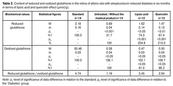 As is evident from reported data the reduced glutathione content in the untreated diabetic animals’ retina has reduced to 61.9% with respect to the standard of (2.18 ± 0,16) µmol/g. In terms of lipoic acid application in two months after the diabetes progress the reduced glutathione content in the retina has increased up to (1.72 ± 0.13) µmol/g; that is it increased by 107.2% (p <0.001) compared to the ‘untreated’ group (0.83 ± 0.06) µmol/g. In terms of quercetin effect the reduced glutathione content has increased by 84.3% (1.53±0.12) µmol/g with respect to the group animals that did not receive the medical product (р<0.001). In two months of the diabetes progress in terms of lipoic acid application the reduction of oxidized glutathione content down to (0.48 ± 0.04) µmol/g is indicated in the retina, which amounted to 87.3% compared to the ‘untreated’ group (0.55 ± 0.03) µmol/g. In terms of quercetin effect the oxidized glutathione content has decreased with respect to the group of untreated animals by 10,9%, i.e. (0.49 ± 0.04) µmol/g. The oxidized glutathione content in the group of untreated animals has increased by 19,6% compared to the standard of (0.46 ± 0.03) µmol/g. The data on the reduced and oxidized glutathione content in albino rats’ retina with streptozotocin-induced diabetes in 6 months after being exposed to lipoic acid and quercetin are outlined in Table 2.