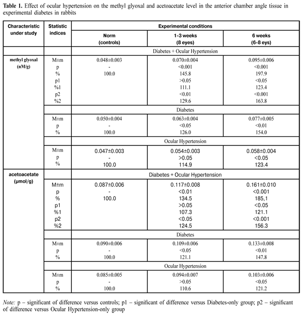 The carbonyl group level in the anterior chamber angle tissue in diabetic rabbits with ocular hypertension increased to 125.5%, i.g. (6.70±0.47) nM/g (р<0.05) and to 176.2%, i.g. (9.41±0.60) nM/g as compared to the norm (5.34±0.30) nM/g (р<0.001). The carbonyl group level in the anterior chamber angle tissue in rabbits with ocular hypertension-only increased to 105.6%, i.g. (5.46±0.32) nM/g and to 1114.9%, i.g. (5.94±0.34) nM/g at time points of 1-3 weeks and 6 weeks, respectively, as compared to the controls (5.17±0.36). Herewith, the increase in the carbonyl group level in the anterior chamber angle tissue was high in rabbits in diabetes and ocular hypertension group than that in ocular hypertension-only group. Thus, the difference was equal to 22.7% (р<0.05) and 58.4% (р<0.001) at time points of 1-3 weeks and 6 weeks, respectively. In diabetes-only group, the carbonyl group level in the anterior chamber angle tissue increased to 118.7%, i.g (6.54±0.36) nM/g (р<0.05) and to 141.2%, i.g (7.78±0.45) nM/g at time points of 1-3 weeks and 6 weeks, respectively, compared to the controls (5.51±0.30) nM/g (р<0.01). It should be noted, that within the study period, the carbonyl group level in the anterior chamber angle tissue was increased in rabbits with diabetes and ocular hypertension as compared to that in rabbits in diabetes-only group. Thus, the difference was equal to 2.4% and 20.9% (р<0.05) at time points of 1-3 weeks and 6 weeks, respectively. Thus, as can be seen from the data obtained in this study, the development of ocular hypertension in the streptozotocin-induced diabetic rabbits results in the increase in methyl glyoxal and acetoacetate levels and in the protein carbonyl group concentration in the anterior chamber angle tissue. We suppose that the state of oxidative stress in the anterior segment of the eye under the conditions of increased IOP plays the main role in the increased rate of glycation in the anterior chamber angle tissue in ocular hypertension, which is mostly apparent in the streptozotocin-induced diabetic rabbits. This is confirmed by studies on peroxidation in the aqueous humor, tear fluid and anterior chamber angle tissue in glaucoma [17, 3, 1, 18]. In general, the data obtained give an insight into pathogenic mechanism underlying the development of glaucoma in diabetes patients. Conclusions 1. Ocular hypertension in rabbits with diabetes results in a jump in the hydroxy aldehyde level in the anterior chamber angle tissue. In such conditions, the methyl glyoxal level is significantly higher than that in animals with models simulating separately either ocular hypertension or diabetes. 2. A significant increase in the carbonyl group level was revealed in diabetic animals with ocular hypertension; this is evidence that the damage of proteins in drainage system of the eye is more severe in concomitant diseases.