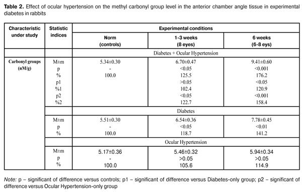 The table shows that the methyl glyoxal level in the anterior chamber angle tissue in rabbits with diabetes and ocular hypertension increased to 0.070±0.004 nM/g (145.8%) (р<0.001) and to 0.095±0.006 nM/g (197.9%) (р<0.001) at time points of 1-3 weeks and 6 weeks, respectively, as compared to the norm 0.048±0.003 nM/g (р<0.001). The measurement of the methyl glyoxal level in the anterior chamber angle tissue in rabbits with ocular hypertension revealed its increase to 0.054±0.003 nM/g (114.9%) and to 0.058±0.004 nM/g (123.4%) at time points of 1-3 weeks and 6 weeks, respectively, as compared to controls 0.047±0.003 nM/g (р<0.05). Comparing the data of these two groups (diabetes and ocular hypertension/ocular hypertension), it can be seen that the increase in the methyl glyoxal level in the anterior chamber angle tissue was higher in the former than in the latter. Thus, the difference was 29.6% and 63.8% at time points of 1-3 weeks and 6 weeks, respectively (р<0.001). It should be noted that the methyl glyoxal level in the anterior chamber angle tissue in rabbits with diabetes increased to 0.063±0.004 nM/g (126%) (р<0.05) and to 0.077±0.005 nM/g (154%) at time points of 1-3 weeks and 6 weeks, respectively, as compared to the controls 0.050±0.004 nM/g (р<0.01). Herewith, this statistic index of the group with diabetes and ocular hypertension was higher than that in the diabetes-only group. Thus, the increase was equal to 11.1% and 23.4% at time points of 1-3 weeks and 6 weeks, respectively, (р<0.05). As can be seen in the Table 1, the acetoacetate level in the anterior chamber angle tissue in rabbits with diabetes and ocular hypertension was increased and equaled 134.5% (0.117±0.008 µmol/g) (р<0.01) and 185.1% (0.162±0.010 µmol/g) at the first time point and the second time point, respectively, as compared to the norm 0.087±0.006 µmol/g (р<0.001). In rabbits with a model simulating ocular hypertension, the acetoacetate level in the anterior chamber angle tissue increased to 0.094±0.007 µmol/g (110.6%) and to 0.103±0.006 µmol/g (121.2%) comparing to the controls (0.085±0.005) µmol/g (р<0.05). It should be pointed, that within the study period, the acetoacetate level in the anterior chamber angle tissue was increased in diabetic rabbits with ocular hypertension as compared to that in animals in ocular hypertension-only group. Thus, the difference was equal to 24.5% (р<0.05) and 56.3% (р<0.001) at the first time point and the second time point, respectively. The acetoacetate level in the anterior chamber angle tissue in diabetic rabbits with ocular hypertension was increased and equaled 134.5% (0.117±0.008 µmol/g) (р<0.01) and 185.1% (0.162±0.010 µmol/g) at the first time point and the second time point, respectively, as compared to the norm 0.087±0.006 µmol/g (р<0.001). The acetoacetate level in the anterior chamber angle tissue in rabbits with diabetes-only increased to 121.1% (0.109±0.006 µmol/g) (р<0.05) and to 147.8% (0.133±0.008 µmol/g) at the first time point and the second time point, respectively, as compared to the controls 0.090±0.006 µmol/g (р<0.01). It should be noted that the increase in the acetoacetate level in the anterior chamber angle tissue in diabetic rabbits with ocular hypertension was higher than that in diabetes-only rabbits. Thus, the difference equaled 7.3% and 21.1% at the first time point and the second time point, respectively. The Table 2 demonstrates the data on the effect of ocular hypertension on the carbonyl groups in the anterior chamber angle tissue in experimental diabetes in rabbits.