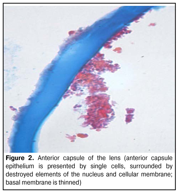It should be noted that, in three cases of PC PIOL removal, the integrity of anterior capsule of the lens was broken since PIOL was fitting closely to the anterior capsule and the space between the capsule and the lens was filled in with fibrous cells. The presence of fibrous cells was evidenced by further histological and electron microscopic tests (Fig. 2).
