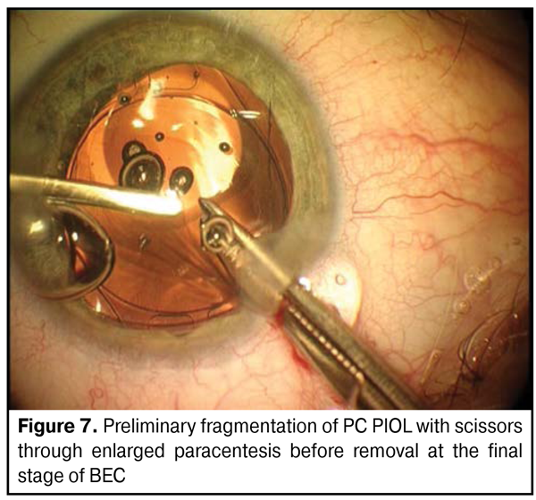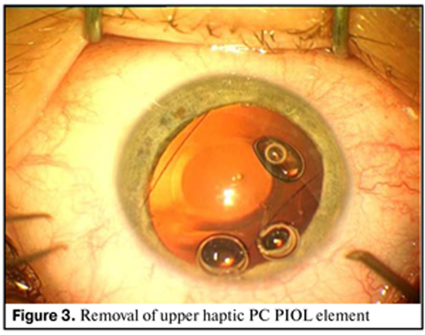 Removal of posterior chamber (PC) PIOL into the anterior chamber was performed with a spatula bringing from the haptic part of the lens toward the center of the optic in the smallest part of IOL by its dislocation. On completion of PIOL removal into the anterior chamber, PIOL was cut and explanted by parts through 3.5-4-mm corneal tunnel incision (Fig. 1).
