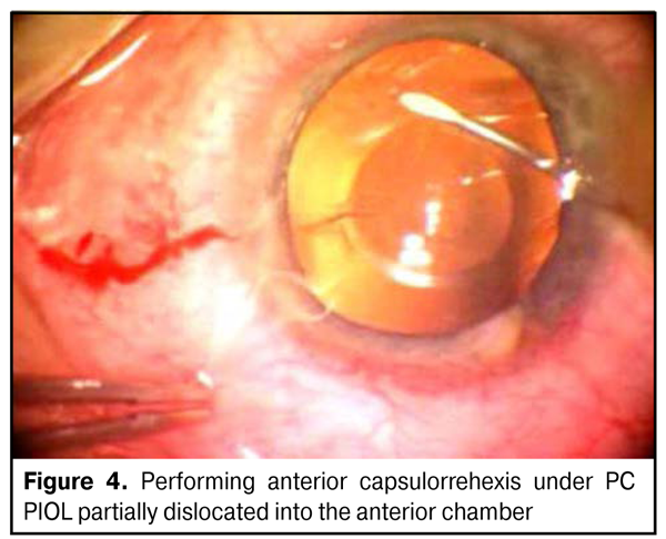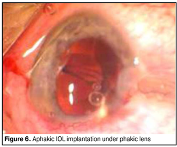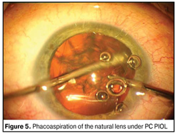 Through the opening obtained, the lens bag content was washed and, afterwards, posterior model of aphakic IOL was implanted. Differential characteristic of cataract developed in the eyes with PIOLs implanted previously is the first degree of lens nucleus density that made it possible not to use ultrasound to destroy it.