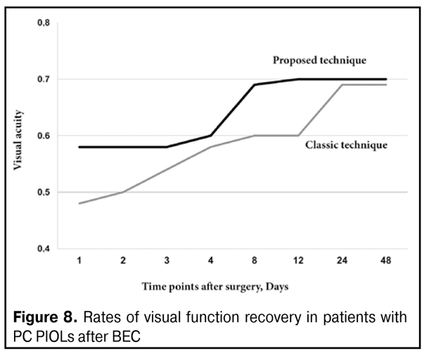 There was noted a tendency of a more rapid visual function recovery (on the average, at Day 5 after surgery) (Fig. 8).
