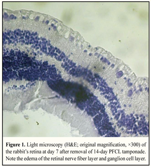 Introduction Posterior subtotal pars plana vitrectomy (PST_PPV) is still considered the gold standard for repair of retinal detachment of any cause. In PST_PPV, vitreous and fibrovascular membranes should be removed as completely as possible. In most cases, post-surgical tamponade of the vitreous cavity is required to achieve anatomical re-attachment of the retina. Light silicone oil and gas-air mixtures are effective tamponade agents in management of most retinal detachments (RDs). Surgical management of severe rhegmatogenous or traction RDs associated with inferior giant retinal tears and retinal breaks [1], anterior proliferative vitreoretinopathy (APVR) [2], or large diameter macular holes [3], however, requires heavy tamponade agents to exert the maximum tamponading effect on the inferior retina [4]. Although the use of such agents contributes to significant improvement in anatomic outcomes, the treatment does not always result in a satisfactory functional outcome, which may be associated with intraoperative trauma, toxic or mechanical damage from the tamponade agent. It is deemed important to compare the mechanical effects of perfluorocarbon liquid (PFCL) (perfluorodecalin with a specific gravity of 1.94 g/cm3) and heavier-than-water fluorinated silicone oil (specific gravity, 1.02-1.06 g/cm3) on the retina using light and electron microscopy. In addition, a highly sensitive technique (such as electroretinography (ERG)) enabling the identification of local damage to various retinal layers at pre-clinical stage may be used to assess functional alterations. The PFCL with specific gravities ranging from 1.54 g/cm3 to 1.94 g/cm3 (perfluoro-n-octane, 1.76 g/cm3; perfluortributylamin, 1.89 g/cm3; perfluorotri-n-propylamine, 1.839 g/cm3; perfluorodecalin, 1.94 g/cm3, etc.) are used in clinical practice. For an experimental study, it may be reasonable to use the PFCL with high specific gravities, since the absence of damage in the use of such compounds would mean indirectly that the use of PFCL with lower specific gravities is safe. The purpose of the study was to investigate experimentally the effect of shor-term (14-day) tamponade with PFCL versus heavy silicone oil on the structure and bioelectric functional activity of the rabbit’s retina over time. Materials and Methods A total of 6 Chinchilla adult male rabbits (12 eyes; age, 6.5 ± 0.5 months; weight, 3.5 ± 0.5 kg) were used in the study. PFCL and heavy silicone oil tamponade duration was 14 days. Each animal underwent electroretinography at the baseline (preoperatively) and at one of the three time points after removal of PFCL and heavy silicone oil tamponades. In addition, it underwent light and electron microscopy at the same time point after removal of PFCL and heavy silicone oil tamponades. After removal of the tamponades, rabbits were divided into three groups of two animals each, based on examination time point used in the study: Group 1, Group 2, and Group 3, with examination (i.e., light and electron microscopy and ERG) performed at 7, 14 and 30 days, respectively, after removal of the tamponade. Circumstances relating to animal care and experimentation met the International Guiding Principles for Biomedical Research Involving Animals as issued by the Council for the International Organizations of Medical Sciences. Operative technique Preoperatively, the rabbits were anesthetized with intramuscular thiopental sodium (2 mg/kg) and received an epibulbar injection of 0.5% proxymetacainum. Mydriasis was obtained by using one drop each of 1% atropine sulphate and 2.5% phenylephrine. Additionally, each animal received an epibulbar injection of 0.3% ofloxacinum. Posterior subtotal pars plana vitrectomy (PST_PPV) was performed under microscope observation (Zeiss OPMI 8) using a KFE-01-MEDA-NN vitrectomy system with cutting rates of 1200 cuts/min, aspiration pressure of 150 mm, and 23-G and 20-G tools. Rabbits were treated with 1.5 ml of PFCL (perfluorodecalin) and 1.0-1.5 ml of heavy silicone oil, injected into the right and left eyes, respectively. After completion of vitrectomy, 0.3% ofloxacin ointment was applied to the conjunctival sac. Removal of PFCL and silicone oil or was performed under microscope observation (Zeiss OPMI 8) using a KFE-01-MEDA-NN vitrectomy system with aspiration pressure of 150 mm Hg. Histological examination The retina was dissected from the enucleated eye, ?xed in 10% neutral-buffered formaldehyde and embedded in paraf?n. Thin sections were cut and stained with hematoxylin and eosin. Histologic evaluations of retina sections were performed by light microscopy with a Jenamed 2 2-fluorescence microscope (Carl Zeiss Jena, Germany). Inferior retinal tissue pieces were fixed in 2.5% phosphate-buffered glutaraldehyde (pH 7.4), postfixed in 1.0% phosphate-buffered osmic acid (pH 7.4), dehydrated in graded alcohols, and embedded in Epon-Araldite. Thin sections were cut, stained with Reynolds lead citrate, and examined in a PEM-100-01 electron microscope. ERG recording technique The animals were anesthetized with an epibulbar injection of 0.5% proxymetacainum. Mydriasis was obtained by using one drop each of 1% atropine sulphate and 2.5% phenylephrine. The Ganzfeld electroretinogram was performed with the Retiscan system (Roland Consult, Stasche & Finger GmbH, Brandenburg) as per ISCEV Standard for full-field clinical electroretinography comprising scotopic rod response, maximal combined scotopic response, scotopic oscillatory potentials, photopic single-flash cone response, and photopic 30-Hz flicker cone response. The full-field Ganzfeld electroretinogram (gERG) reflects the electric response of the entire retina to a flash of light (Ganzfeld stimulation is achieved with a bowl perimeter). A contact lens electrode was used for recording ERG responses. Electroretinography was performed at one of the three time points (7, 14 or 30 days) after removal of tamponade. Results Structural and functional retinal cha