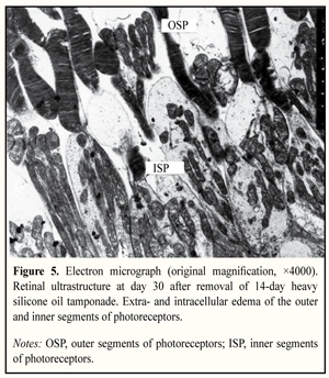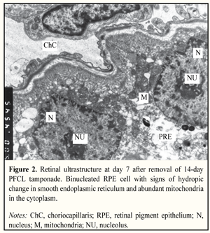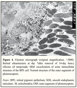 Furthermore, the photopic ERG showed no significant change in activity indices of photoreceptor layer of the central retina (with a-wave amplitude increased to 43.0 ± 4.0 µV) and inner retinal layers (with the b-wave amplitude increased to 69.8 ± 4.5 µV and the implicit time increased by 32.8%) compared to the mean baseline value (35.2 ± 2.2 ms, p = 0.001). The 30-Hz flicker ERG showed that N1-P1 amplitude of the response increased by 41% (to 48.0 ± 3.0 µV) and P1 implicit time increased by 27% (to 60.0 ± 0.5 µs) (Table 2). Therefore, a week after removal of tamponade, a response of photoreceptor and inner retinal layers of the peripheral and central retina (bipolar and M?ller cells, including those of the cone system) to the stimulation was revealed, which was reflected in increased implicit time and increased ERG amplitude (a finding of supernormal ERG). At day 14 following removal of PFCL, in the combined rod–cone response, a-wave amplitude increased by 7.4% compared to that at day 7, amounted to 54.5 ± 6.0 µV, and remained higher than that at baseline (19%, p = 0.01). In addition, the activity of the inner retinal layers (b-wave implicit time and amplitude (216.0 ± 5.0 µV) did not change significantly, and was higher than the norm (68.8%, p =0.01) (Table 2). Therefore, the activity of photoreceptor and inner retinal layers of the peripheral retina did not change significantly after day 7. Moreover, at day 14 following removal of PFCL, the photopic ERG which reflects the function of the central retina had the following features: Although the a-wave implicit time did not change, the amplitude decreased by 63.5% compared to that at day 7 and amounted to 15.7 ± 4.0 µV (p = 0.001), a factor of 2.2 lower than that the norm; the b-wave implicit time (31.0 ± 1.2 µs) (р = 0.02) remained excessive, whereas the amplitude increased by 47% compared to that at day 7, and amounted to 103.0 ± 6.50 µV (p = 0.001). The functional state of the retina at day 14 following removal of PFCL was characteristic of decreased response (depression) of central retinal photoreceptors with increased activity (irritation) of the inner layers of the whole retina. At day 30 following removal of PFCL, in the combined rod–cone response, a-wave implicit time increased from 13.0 ± 0.4 to 21.3 ± 3.4 µs (р=0.01), whereas the amplitude decreased by 34.2% compared to that at day 7, and amounted to 28.8 ± 2.70 µV (p = 0.01), thus evidencing early dystrophic changes in the peripheral retinal photoreceptors. By that day, activity values of the inner retinal layers were not restored to baseline values, and b-wave imlicit time was 30.1% higher than the norm (p = 0.01), although the amplitude was 25% lower (162.1 ± 10.1 µV) (p = 0.01) than that at day 14. In addition, no significant changes in photopic ERG measures were observed between the 14-day ERG responses and the 30-day ERG responses, although a tendency was observed towards increasing depression of the central retinal photoreceptors (Table 2) and increasing delay in response of the inner retinal layers (35% increase in b-wave implicit time; p = 0.01; the 30-day b-wave implicit time of 42.0 ± 1.5 µs), and the b-wave amplitude was elevated (98.8 ± 10.0 µV) compared to the mean baseline value (68.1 ± 6.9 µV). Therefore, at day 30 after removal of PFCL, functional activity of the central retina was characteristic of delayed response (increased implicit time) and reduced amplitude of photoreceptor response (initial dystrophy of photoreceptors) to the test flash. Inner layers of the central and peripheral retina were characteristic of increased implicit time and hyperresponsiveness to the stimulus; that is, no complete normalization of the functional state of the retina was observed and may require longer observation periods. Structural and functional retinal changes in two-week tamponade with heavy silicone oil Electron microscopy revealed that at days 7 and 14 after the removal of heavy silicone oil tamponade, the choriocapillary lumen was enlarged. In addition, vacuolation of SER was seen in RPE cells (Fig. 4). The inner and outer photoreceptor segments were swollen. Manifestations of hydropic change were seen within the outer and inner plexiform retinal layers. In addition, within the ganglion cell layer, cytoplasmic vacuolation was observed in the ganglion cells and the M?ller cells showed vacuolation of cells processes.