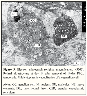 Hydropic structural changes were revealed within the internal retinal layer. Mild vacuolization of M?ller cell (MC) processes and enlargement of mitochondria occurred within the ganglion cell layer. At day 14 after removal of PFCL tamponade, most of the choriocapillaries were significantly dilated. In the microvessels, the lumen contained fine granular material of moderate electron density. RPE cells incorporated normal organelles and showed marked apical-basal polarity. Mild cytoplasmic vacuolation was observed at the expense of mitochondria and SER elements. Smooth endoplasmic reticulum membranes were swollen and exhibited localized areas of fragmentation. Within the photoreceptor layer, a portion of the cells showed evidence of edema of the inner segments and mitochondrial disorder. Photoreceptor nuclear layer and inner retinal neurons appeared normal. Marked hydropic changes along the internal retinal layer were present. Ganglion cells had nuclei with large nucleoli and contained cytoplasm with abundant granular endoplasmic reticulum (GER) and small, vacuolated mitochondria. M?ller cell processes surrounding neurons in the retinal ganglion cell (RGC) layer were characterized by mild cytoplasmic vacuolation (Fig. 3).
