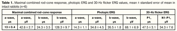 At day 30 after removal of PFCL tamponade, choriocapillaries were dilated. The lumen contents appeared normal. Although a portion of RPE cells appeared normal, other RPE cells showed pathology with cellular vacuolization and localized areas of destruction of SER elements. In addition, some RPE cells had two nuclei and abundant mitochondria with signs of activity. Localized areas of destruction of apical microvilli of RPE cells were seen. Signs of edema were present in some inner segments and damaged membrane structures were seldom seen in outer segments of photoreceptor cells. Hydropic changes were noted within the internal retinal layer. Within the ganglion cell layer, large cells had abundant organelles participating in protein synthesis, mitochondria, etc. M?ller cell processes surrounding neurons in the RGC layer showed minimal vacuolation. At day 7 following removal of PFCL, in the rabbit’s combined rod–cone response, a-wave implicit time was not significantly different from, whereas the amplitude was 28% increased (to 54,5 ± 6,0 (µV) compared to the mean baseline value, thus evidencing an increased response to the stimulus in the photoreceptor layer of the peripheral retina. In addition, the response to the stimulus in the inner retinal layers was characteristic of increased b-wave implicit time (35.2 ± 4.0 ms, p = 0.01) and amplitude (228.5 ± 6.2 µV), with the amplitude being increased by 77% compared to the mean baseline value (p = 0.001) (Tables 1, 2).