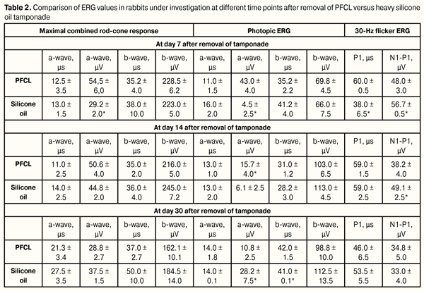 Comparative analysis of bioelectric activity of the rabbit retina after removal of a vitreous tamponade agent (PFCL or heavy silicone oil) revealed that, at day 7, in the rabbit’s combined rod–cone response, the a-wave amplitude in the silicone group was 46% lower (p = 0.001) (Table 2) than in the PFCL group, and 31.4% lower (p = 0.001) than the norm, this finding reflecting the depression in activity exhibited by the photoreceptor layer of the peripheral retina. No difference was found in bioelectric activity exhibited by the inner layers of the peripheral retina between these two groups, with this activity characterized by increased b-wave amplitude reactivity (74-77% higher than the norm). In addition, in the silicone group, there was depression in activity exhibited by the photoreceptor layer of the central retina in the photopic ERG a-wave, with the amplitude of 4.5 ± 2.5 µV being 86% lower than the norm (p = 0.001), whereas the activity of the inner layers of the central retina was normal. At day 14 after removal of tamponade, the response of the peripheral retinal photoreceptors to the stimuli in the silicone group became normal, whereas increased reactivity of the inner retinal layers in both groups maintained (Table 2). In addition, the depression in activity exhibited by the photoreceptor layer of the central retina in the silicone group remained stable (with the a-wave amplitude of 6.1 ± 2.5 µV), whereas reactivity of the inner layers of the central retina became increased (with the b-wave amplitude of 113.0 ± 4.5 µV). At day 30 after removal of heavy silicone oil, in the rabbit’s combined rod–cone response, the activity of the inner layers of the peripheral retina reduced by 24.8% (p = 0.01) compared to that at day 14, but was still higher (by 43%) compared to the mean baseline value (p = 0.01). In addition, although some positive changes were observed (the bioelectric activity of the central retinal photoreceptors improved), no changes were observed in over-reactivity of the inner retinal layers (the amplitude was 112.5 ± 4.5 µV), which was 64.7% higher than the norm (p = 0.001). Discussion A number of studies have investigated this issue. Some of them report on the development of irreversible atrophic changes in the rabbit retina following intravitreal placement of perfluoro-n-octane for 48 hours [5] or perfluorodecalin for 2 weeks [6]. One of the explanations for the difference in results between those studies and ours may be the difference in conditions for conduct of experimental studies. The use of gas compression of the vitreous by those investigators could contribute to additional damage to the retinal ultrastructure. Flores-Aguilar et al [7, 8] have reported that no morphological, functional or clinical changes in the retina and lens were observed during three months of follow-up after intraocular post-vitrectomy placement of PFCL (perflubron). According to Chang [6], after removal of 2-day perfluoro-n-octane tamponade, a-wave and b-wave amplitudes were reduced by 40% and 46%, respectively. Restoration of b-wave amplitudes to pre-vitrectomy levels began after day 5 and completed by month 2 after removal of PFCL, whereas a-wave amplitude restored to pre-vitrectomy levels by day 5 [6]. Brian et al have reported that a marked dampening of elecroretinigraphic response normalized at 14 days after removal of 24-hour or 2-week perfluorotri-n-propylamine tamponade. Therefore, our findings of the supernormal ERG response are opposed to the findings of Brian et al [9], and this is most likely due to the difference in experimental methodology. Chang et al [6] and Brian et al [9] used gas compression of the vitreous, whereas we performed PST_PPV that results in changes in the content of the vitreous cavity, with increase in concentrations of calcium, magnesium and protein and decrease in that of potassium [10]. It has been demonstrated in experimental models that the increases in a-wave and b-wave amplitudes are observed after reduction in temperature, increase in pH, and changes in ion composition in the contents of the of the vitreous cavity [11, 12]. An increase in the b-wave amplitudes of the ERG elicited by white-light or red-light stimulus at 1 month after PFCL injection into the rabbit’s vitreous has been reported by Shkvorchenko [13], who believes that these changes were associated with transudative processes. At four months after the intervention, all electroretinographic parameters restored to normal. In all the studies mentioned above, balanced salt solution was used as the control. In our experimental study, we found no significant difference between PFCL and heavy silicone oil in their effect of on the ultrastructure and functional state of the retina. Conclusions First, the features of the effects of 14-day PFCL and heavy silicone oil tamponade on the ultrastructure and functional activity of the rabbit retina were determined during the 30-day follow-up after removal of tamponade. PFCL and heavy silicone oil tamponade were found to result in similar quantitative and qualitative changes in retinal structure, which are reversible and non-degenerative in nature. Second, after removal of PFCL tamponade, the amplitude of the response of the inner peripheral retina and that of the inner central retina were increased by 30.1% and 44%, respectively. The effect of 14-day heavy silicone oil tamponade on the retina after removal of the tamponade was comparable to that of PFCL tamponade: the amplitude of the response of the inner peripheral retina and that of the inner central retina were increased by 43% and 64.7%, respectively. Restoration of bioelectric activity of the retina to baseline levels after removal of 14-day PFCL or heavy silicone oil tamponade requires a longer period than 30 days. References 1.Sirimaharaj M, Balachandran C, Chan WC, et al. Vitrectomy with short term postoperative tamponade using perfluorocarbon liquid for giant retinal tears. B