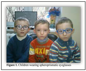 Background: Strabismic children develop early motor and/or sensory complications (amblyopia, poor fixation of the eye, impaired fusion, and impaired binocular vision). The major goals of treatment for strabismic amblyopia are to remove strabismus, to improve the vision of the amblyopic eye, and to restore the binocular vision. Prisms and apparatus-based orthoptics techniques have been used for a long time for the treatment of impairments in binocular vision. In Ukraine, the technology for manufacture of spheroprismatic lenses designed as microprismatic combination eyeglasses was developed in 2009.
