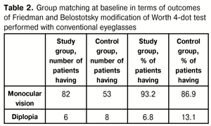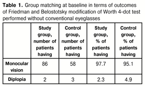 Friedman and Belostotsky modification of Worth 4-dot test (with uncorrected ametropia and, subsequently, with correction for ametropia) was used to determine the character of vision in any of the two groups. In addition, modified Fresnel microprisms in conjunction with lenses for correction of ametropia were used for this purpose in the study group.