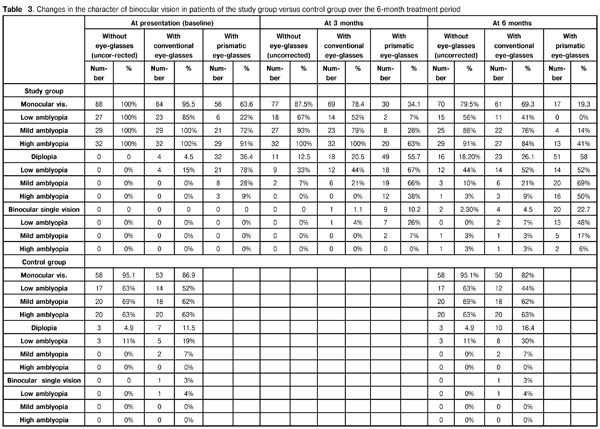 At 3 months, with uncorrected ametropia, monocular vision and diplopia were found in 77 children (87.5%) and 11 children (12.5%), respectively, of the study group. Out of the latter children, 9 and 2 had low and mild degrees of amblyopia, respectively, making up 12.5% and 7.0% of the relevant amblyopia subgroups. After correction with conventional glasses for ametropia, diplopia was found in 18 children (20.5%) of the study group; in addition, binocular single vision was found in 1 child who had a low degree of amblyopia. After correction with prismatic glasses, monocular vision, diplopia and binocular single vision were found in 30 children (34.1%), 49 children (55.7%), and 9 children (10.2%), respectively, of the study group. Out of the latter children, 7 and 2 had low and mild degrees of amblyopia, respectively, making up 26.0% and 7.0% of the relevant amblyopia subgroups.