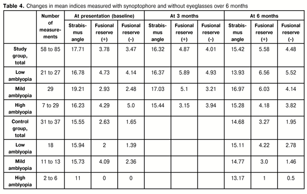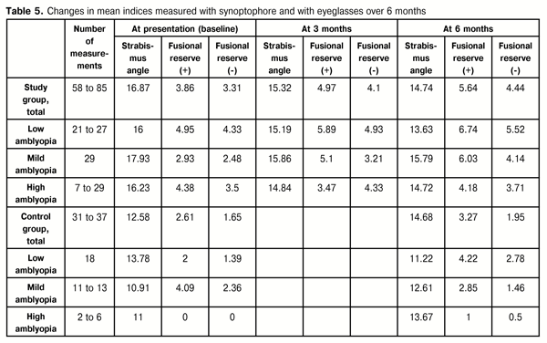 At baseline, mean fusion amplitude (with corrected or uncorrected ametropia) in the study group was 7.25 versus 4.28 in the control group. At 3 months, mean fusion amplitude in the study group increased to 8.88. In addition, at 6 months, mean fusion amplitude in the study group increased to 10.06, versus 5.22 in the control group. Interestingly, that in some cases of the study group or the control group, mean fusion amplitude values before treatment were better than those after treatment (Tables 4 and 5).