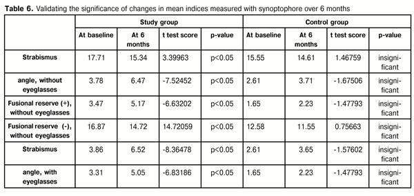 The paired t test was used to check for the significance of changes. A value of p < 0.05 was considered significant. It was found that changes in fusional reserves (with corrected or uncorrected ametropia) in the study group over treatment period were substantial and statistically significant, whereas changes in fusional reserves in the control group were insignificant in all the cases (Table 6).
