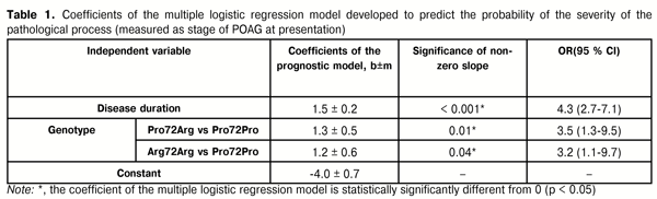 First, the study found some patterns in the emergence and progression of POAG. It revealed associations between the severity of the pathological process (measured as stage of POAG at presentation) and disease duration, and between the severity and disease genotype. After adjustment for other independent variables, patients with p53 Pro72Arg genotype had 3.5 times higher odds of a severe stage of POAG compared to those with Pro72Pro genotype (p=0.01, OR = 3.5 (95 % CI=1.3-9.5).