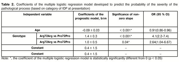 Multiple logistic regression model analysis revealed an association between the severity of the pathological process (based on the category of IOP at presentation) and patient’s age: the risk of elevated IOP decreased with each 1-year increase in patient’s age (p < 0.001; OR = 0.91; 95 % CI = 0.86-0.96). After adjustment for age, the odds of a severe stage of POAG at presentation increased more than 4 times with each 1-year increase in duration of disease (p<0.01, OR =4.1 (95 % CI=2.2-7.4). After adjustment for other independent variables, patients with p53 Arg72Arg genotype had 2.64 times higher odds of a more advanced IOP category compared to those with Pro72Arg or Pro72Pro genotype (p=0.04, OR = 2.64; 95 % CI=1.04-6.67).