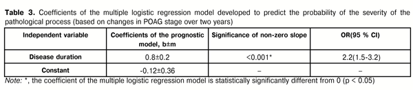 where Y1D is the probability of any progression in the development of the pathological process (based on the changes in POAG stage over two years), T is duration of disease (years)