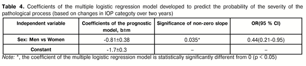 A multivariable model was developed using a backward stepwise selection procedure to select independent variables associated with any progression in the development of the pathological process (based on the changes in IOP category over two years; exclusion threshold, P > 0.1). Only one independent variable, patient’s sex, was selected. The model was based on this variable, and the model fit was adequate (?2=4.6; p=0.03). The area under the receiver operating characteristics curve was statistically significantly (p < 0.001) higher than 0.5 (AUC=0.60, 95 % CI=0.52-0.67). Table 4 presents the results of the analysis of the association of the changes in IOP category over two years with independent variables in a multiple logistic regression model. A model for predicting the progression in the development of the pathological process (based on the changes in IOP category over two years) can be described by equation 4: