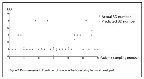 To assess the adequacy of the predictive model developed we used an approach as follows: a raw corresponding to a dataset of the one patient was extracted from the learning sample and the model was resynthesized; predicting impatient treatment duration was computed for each set of parameters (data of one patient) in the sampling. Such validity showed that the number of days of patient’s actual staying in hospital and those obtained using the predicting model agreed significantly (Figure 2).