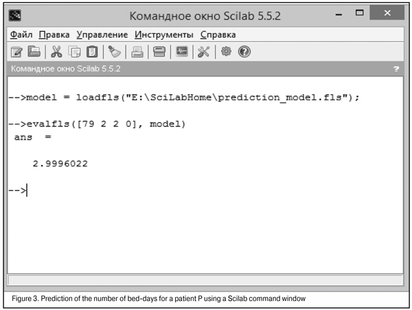 A command «model = loadfls("E:\SciLabHome\prediction_model.fls");» download the fuzzy prediction model (saved on the hard disc as a file«prediction_model.fls») into Scilab internal storage and save in a variable «model». The following command « evalfls([хххх], model) » performs a computation of the number of inpatient stay days.