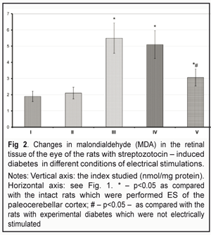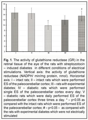 Thus, the data obtained evidenced that the development of experimental streptozotocin-induced diabetes was accompanied by increased peroxide processes in the retinal tissues which were determined as a decrease in the GR activity and the increased level of MDA. Such changes are common for experimental diabetic retinopathy [1, 5]. Besides, the rats were observed significant weight loss associated with diabetes. The disorders pointed were prevented with periodical ESs of the paleocerebellar cortex and the effect of the similar ES in the intact rats was not accompanied by the changes in the indices studied. It should be noted that such a character of the effects of cerebellar ESs, in a great degree, matches the character of the effects of direct retinal ESs. Thus, ES of the retina had a prominent inhibitive effect on the secretion of interleukin (IL)-1? and tumor necrosis factor (TNF)-? in microglia, isolated from Sprague-Dawley rats, and resulted in the increased production of brain-derived neurotrophic factor (BDNF) and ciliary neurotrophic factor (CNTF) in M?ller cells [8]. In similar conditions, downregulation of Bax, an apoptotic-associated gene, was observed [11]. Besides, the neuroprotective mechanism is an increase in insulinlike growth factor (IGF-1) production by M?ller cells [9]; ES resulted in elevated fibroblast growth factor-2 in the culture of the retinal M?ller cells [8, 9]. Similar changes as well as differentiated expression of more than 490 genes [6] which is observed in ES conditions, occurs during the first hour, maintains for 35 hours after electrical stimulation and is accompanied by increased production of twenty-five proteins including cell signal proteins, proteins associated with synaptic transmission, metabolic proteins, immunological factors and structural proteins, are considered as a strong anti-inflammatory effect. The pointed profound changes in metabolism of the nerve tissue also resulted in maintenance of the body weight of the diabetic rats, which can be associated with the effect of cerebellar ES on leptin production [3]. Besides, the maintenance of the body weight is an evidence of safety and an important indicator that an ES procedure has no side effects [5]. A possible mechanism of the ES effects on the state of the retina, the character of which corresponds to the effect of the direct ES of the retina, consists in antidromous celereal-tectonic-retinal actions that are provided through corresponding retinal-collicular-perebellar connections [10] and accompanied by the normalized cytokine production, the decreased nitrosative stress and neuroprotection [1, 2]. Since ES of the cerebellar structres is safer than the direct transorbital, transpalpebral, or transcortical ES effect, the further investigations on the optimizing use of the cerebellar ES in ophthalmological practice can be considered reasonable. Conclusions 1. The data obtained evidenced that ES of the paleocerebellar cortex prevented the body weight loss 2. ES of the paleocerebellar cortex prevented the STZ-diabetes-associated decrease in the GR activity as well as the increase in the MDA level in the retinal tissue. 3. ES of the paleocerebellar cortex caused no changes in the indices studied in the retinal tissues of the intact rats.