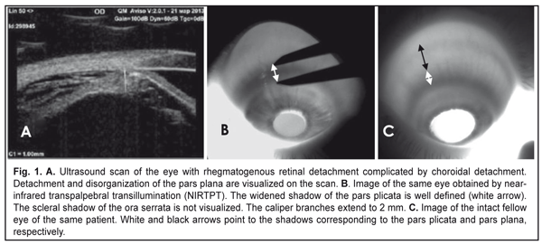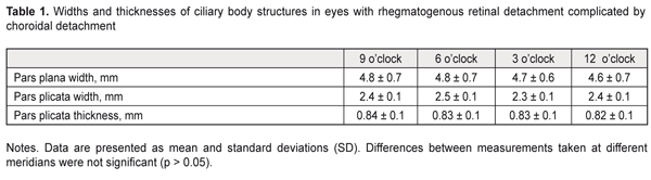 Background: Rhegmatogenous retinal detachment (RRD) can be complicated by choroidal detachment (CD). The state of the ciliary body in patients with RRD may indirectly indicate active intraocular inflammation. Purpose: To investigate ciliary body dimensions in RRD complicated by CD after preoperative anti-inflammatory treatment. Materials and Methods: This study included 31 RRD+CD patients (31 eyes) with an intact fellow eye who were under observation. Before the vitrectomy, they received 4-mg intravitreal triamcinolone (IVT), either alone or in combination with 0.5 to 0.8 mL of perfluorpropane. Near-infrared transpalpebral transillumination (NIR TPT) and ultrasound biomicroscopy (UBM) of anterior eye structures were performed before and 1, 2, 3 or 4 days after preoperative intravitreal therapy. Results: Mean baseline width and mean baseline thickness of the pars plicata in eyes with combined RRD and CD were statistically significantly greater than in intact fellow eyes (2.4 ± 0.1 mm versus 1.9 ± 0.1 mm, P = 0.01, and 0.83 ± 0.1 mm versus 0.65 ± 0.1 mm, P = 0.02, respectively). Mean post-treatment pars plana width in the affected eyes having axial length > 25.0 mm was 4.74 ± 0.63 mm, and the percentage of these eyes was 64.5% among eyes with combined RRD and CD. Mean thickness and mean width of the pars plicata in the affected eyes after treatment were 2.2 ± 0.1 mm и 0.66 ± 0.1 mm, respectively. Conclusions: In eyes with combined RRD and CD, pars plicata width and thickness were greater than in intact fellow eyes. Ciliary body detachment tends to occur in longer eyes (therefore, those with a greater pars plana width) with RRD. In eyes with combined RRD and CD, there was evidence of re-attachment of the pars plana as well as reduction in pars plicata thickness and width after preoperative anti-inflammatory treatment. Keywords: rhegmatogenous retinal detachment, ciliary body, infrared radiation, transillumination Introduction Rhegmatogenous retinal detachment (RRD) can be complicated by choroidal detachment (CD) and accompanied by hypotony and intraocular inflammation. This is the most unfavorable type of RRD for prognosis and requires a special treatment strategy. Most probably, a blood ocular barrier breakdown is an early event of CD in the presence of RRD, which explains the efficacy of preoperative anti-inflammatory therapy [1]. Therefore, the state of the ciliary body in patients with RRD may indirectly indicate active intraocular inflammation. The dimensions of ciliary body structures may be objectively assessed by ultrasound scanning or diaphanoscopy (e.g., near-infrared transpalpebral transillumination) [2, 3]. Ultrasound biomicroscopy (UBM) enables precise imaging of anterior eye structures and quantitative measurements. In ultrasound examination, ciliary processes are visualized, and their location, size and shape are identified. In addition, it enables assessing the thickness of cliliary body structures [3]. In RRD complicated by CD, UBM revealed that ciliary body detachment was characterized by the detachment of the pars plana only, whereas attachment of the pars plicata to the sclera was maintained [1]. Diaphanoscopy enables imaging the projection of the ciliary body onto the sclera and assessing the widths of ciliary body structures. Transcorneal or transscleral illumination should be used for visible globe transillumination. Near-infrared transpalpebral transillumination (NIR TPT) enables non-invasive ciliary body imaging and precise assessment of scleral projections of ciliary body structures [3]. The purpose of this study was to investigate ciliary body dimensions in RRD complicated by CD after preoperative anti-inflammatory treatment. Materials and Methods The study was approved by a local Bioethics Committee of the Filatov Institute and included 31 RRD+CD patients (31 eyes) with an intact fellow eye who were under observation. Visual acuity measurement, biomicroscopy, ophthalmoscopy, IOP measurements, NIR TPT and UBM of the ciliary body, choroid and retina were performed for both eyes in all patients before treatment. The ciliary body was visualized with 940-nm NIR TPT [3]. The NIR TPT system used consisted of (1) a wireless LED IR light source with a dominant wavelength of 940 nm, (2) slit-lamp attachable monochrome video camera capable of recording near-IR images and video, and (3) computer with the software for processing the video captured from the camera and transferring the processed signal to the display [4]. Images of scleral shadows of the pars plicata and pars plana extending to the ora serrata were taken and saved in the computer. The widths of the shadows of ciliary body structures were measured with calipers. These measurements were made at four meridians: 12 o’clock, 6 o’clock, nasally (3 o'clock OD and 9 o'clock OS), and temporally (9 o'clock OD and 3 o'clock OS), with the patient sitting at a slit lamp [5]. Ciliary body thickness measurements were made between the ciliary processes located most closely to the scleral spur at four meridians (12 o’clock, 6 o’clock, nasally (3 o'clock OD and 9 o'clock OS), and temporally (9 o'clock OD and 3 o'clock OS)). We used the Aviso UBM unit (Quantel Medical) with a 50-MHz linear probe (axial resolution: 35 µm; lateral resolution: 60 µm). On examination, the patient lying on his back, with the head of the bed raised [1]. Epibulbar anesthesia with ophthalmic 0.5% proparacaine hydrochloride was used in both eyes before UBM examination. Before vitrectomy, patients received 4-mg intravitreal triamcinolone (IVT), either alone or in combination with 0.5 to 0.8 mL of perfluorpropane until IOP became normotensive. The intravitreal anti-inflammatory treatment used in this study aimed to remove intraocular inflammation and resolve the choroidal detachment in order to reduce the risk of intra- and post-operative complications of retinal detachment surgery [1]. One, 2, 3, or 4 days after intravitreal treatment, pa