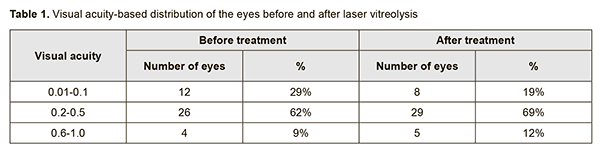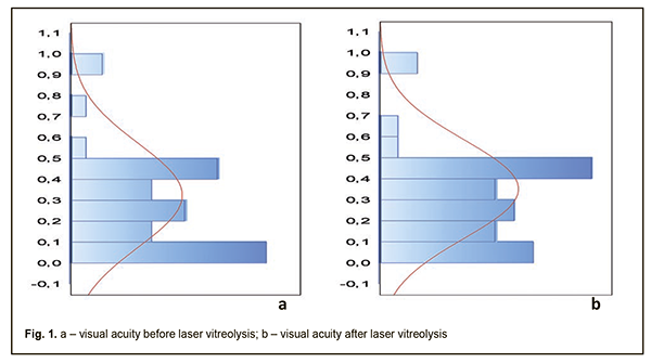 Background. Patients with profilerative vitreoretinopathy are performed vitrectomy which, however, is challenging in the presence of high visual function, transparent lenses, and single vitreoretinal adhesion bands as well as at risk of hemorrhages. Purpose. To determine the efficacy of a two-stage laser treatment, including laser photocoagulation (LP) and laser vitreolysis (LV), for vitreoretinal adhesion bands. Material and Methods. A total of forty-two patients (42 eyes) with fibroplastic changes were treated. Laser interventions were performed in two stages: 1) laser photocoagulation of the retina, in sites where the bands attached the retina, followed by 2) neodymium-doped yttrium aluminum garnet (Nd:YAG) laser vitreolysis. Accurate focusing and adjusting the optimal laser energy contribute to increased treatment efficacy. Results. At the first stage, 36 patients (86%) were performed preventive LP of newly-formed vessels of the bands and limiting LP in the sites of attachment of the bands and membranes. LP was made in the basement of the vitreoretinal bands in the sites where tractional retinal detachment could occur. At 2-3 weeks, after chorioretinal comissura had been formed, Nd:YAG LV was performed. On treatment completion, visual acuity increased by 27% in 28 patients (67%). In addition, the level of intraocular pressure almost did not change (20.0 mm Hg). The present treatment managed to dissect the vitreoretinal adhesion bands and to decrease a degree of traction in 38 patients (67%). Conclusion. The studies showed a high efficacy of a two-stage laser treatment for vitreoretinal adhesion bands which, in certain cases, can be alternative to surgical treatment, vitrectomy and endolaser photocoagulation. Keywords: proliferative vitreoretinopathy, laser photocoagulation, Nd-Yag laser vitreolysis Background Hemorrhage and exudates as a consequence of ocular trauma or uveitis can lead to fibrous proliferation with vitreous adhesion bands and membranes which induce retinal deformation and traction. The frequency of retinal detachment in patients with proliferative vitreoretinopathy ranges from 5.1 to 11.7% [6]. Since medicinal treatment is of low-efficiency nowadays, vitrectomy with separation or fragmentation of the preretinal proliferating tissue is used in order to prevent from developing tractional retinal detachment. Separation or segmentation of vitreous adhesions is an important and difficult task when performing a surgical intervention in the vitreous. Surgery is challenging when performing it in patients with high visual function, transparent lenses, and single vitreous adhesions as well as at risk of hemorrhages. Fibroplastic changes in the vitreous with the presence of vitreoretinal adhesions traditioanally require a two-stage treatment including pars plana vitrectomy and endolaser photocoagulation. However, complications, including cataract, secondary glaucoma, hemorrhages, and recurrent retinal detachment, are observed in 15-46% cases of vitrectomy [2]. Based on literature sources, laser interventions for fibroblastic changes in the vitreous are divided into two freestanding techniques: laser photocoagulation and laser vitreolysis or fragmentation. With the purpose to flatten vitreous adhesion bands, M.I. Beliaieva (2009) recommends performing laser photocoagulation of their surface [1]. In our opinion, however, such operation will result not only in the flattening but in the shrinking and shortening of the vitreous adhesion bands, which can provoke retinal detachment. Some authors have shown that Nd:YAG or Er:YAG laser vitreolysis and fragmentation for vitreous opacities can be used as an independent method of treatment [3, 5]. In the meantime, such manipulations can be connected to a variety of complications including retinal detachment, posterior capsule rupture, and a damage to IOL, so the authors recommend performing such operations very carefully at the distance of 0.5-4.5 mm from the retina [4, 8, 9]. The purpose of the present paper was to determine the efficacy of a two-stage laser treatment, including laser photocoagulation (LP) and laser vitreolysis (LV), for vitreoretinal adhesion bands. Material and Methods A total of forty-two patients (42 eyes) with posttraumatic/uveal fibroplastic changes as vitreoretinal bands and opacities in a shape of flat membranes and masses were treated. The mean age of the patients was 41.7 (SD 16.54); a male/female ratio was 29 (69%) / 13 (31%). At baseline, visual acuity averaged 0.33 (SD 0.25) and ranged from 0.01 to 0.1, from 0.2 to 0.5, and from 0.6 to 1.0 in 13 (31%), 26 (62%), and 3 (7%) eyes, respectively. A level of intraocular pressure (IOP) before treatment averaged 18.5 (SD 1.38) mm Hg ranging from 16.0 to 21.0 mm Hg. Laser interventions were performed in two stages: LP of the retina in sites where the bands attached the retina followed by LV. Selection criteria were the presence of transparency of refractive medium and maximal mydriasis. Retinal LP was performed under topical anesthesia through the Goldman lens using lasers with λ=0.48 and 0.53 µm. Coagulates with a 50-200-μm spot size with a 100-200 µm spacing were made in 3-4 rows in the checkerboard order. Laser power was defined by a state of refractive media of the eye, location, and a pigmentation degree and ranged from 200 to 700 mW with an exposure of 0.15 s. The diameter of laser irradiation was minimal in the macular zone, medium in the paramacular zone, and maximal in the periphery. LV or segmentation of membrane formations using Nd:YAG laser with λ=1.06 µm was performed 2-3 weeks later as the second stage. LV was also carried out under topical epibulbar anesthesia through the Goldman lens with a targeted action precisely focused on the object, greater than 1.0 mm from the retina and the anterior capsule/IOL. Pulse energy ranged from 1.2 to 3.5 mJ. Precise focusing, adapting a contact lens, and adjusting the optimal laser energy contribute to treatmen