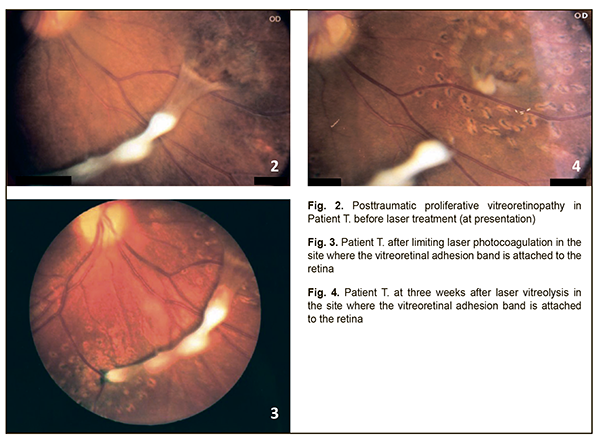 In the meanwhile, a level of IOP did not change significantly and averaged 20.0 (SD 1.13) mm Hg ranging from 18.0 to 22.0 mm Hg. On laser vitreolysis completion and retinal attachment achievement, laser coagulation was repeated; however, this time, it was delivered closer to the center of band attachment site. In four patients (10%), it was impossible to completely dissect the vitreoredinal adhesion bands due to their high density and fibrous thickness; so those patients were performed vitrectomy. The studies showed a high efficacy of a two-stage laser treatment for vitreoretinal adhesion bands which can be alternative to surgical treatment (vitrectomy and endolaser photocoagulation) in certain cases. A clinical case Patient T., aged 45 y/o, applied to SI “The Filatov Institute of Eye Diseases and Tissue Therapy of the NAMS of Ukraine” at 10 months after trauma and a course of medicinal treatment, performed at place of residence, for blunt injury of the right eye and subtotal hemophthalmos. Diagnosis at presentation: OD – proliferative vitreoretinopathy VIS OD = 0.1 (uncorrected); VIS OS = 1.0; IOP OD = 21.0 mm Hg; IOP OS = 17.0 mm Hg Ophthalmoscopy of the right eye in the macular zone at the end site of the adhesion band revealed the elevation and traction of the retina with thinned retinal portions (Fig. 2).