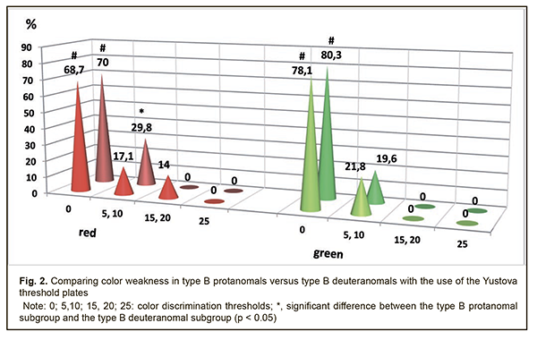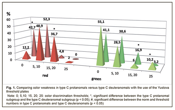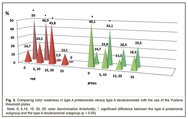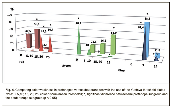Background: The prevalence of congenital color vision defects (CCVD) is reported to be approximately 8% in males and 0.5% in females, and, therefore, the use of optimal tests capable of diagnosing these defects early and accurately, and with all the aspects of color perception deficiency addressed, is important. Purpose: To investigate color weakness in protans and deutans with congenital color vision defects varying in severity. Materials and Methods: The Yustova threshold plates were used to assess color discrimination thresholds in two groups, the protans (253 individuals) and the deutans (374 individuals). The former group included type A, type B, and type C protanomals (61, 49, and 64 individuals, respectively) and 79 protanopes, whereas the latter group included type A, type B, and type C deuteranomals (34, 124, and 127 individuals, respectively) and 89 deuteranopes. At baseline, patients underwent visual acuity assessment (using the Shevalev charts and Golovin-Sivtsev charts), refractometry, biomicroscopy and ophthalmoscopy. Patients were emmetropes, had the visual acuity of 1.0 in either eye, and had neither ocular nor systemic disease. Results: A colorimetric methodology revealed the features of color discrimination thresholds of the R receptor in protans, with mild to moderate red weakness in 31% of the type C protanomals, 85.6% of the type B protanomals, 70.3% of the type A protanomals, and with moderate to severe red weakness in 100% of the protanopes. A mild green weakness was found in 23.7% of the protans with any degree of color anomaly. Of the deutans, 51.8% exhibited a mild red weakness. In addition, 19.6% of the type C deuteranomals exhibited a mild green weakness, 55.5% of the type B deuteranomals exhibited mild to moderate green weakness, and 85.3% of the type A deuteranomals exhibited mild to moderate green weakness. Moreover, a green weakness of any degree was found in all the deuteranopes, with 51.9% of them exhibiting a severe green weakness. Conclusion: Congenital color vision defects are characterized not only by impaired spectral color perception, but also by apparent color weakness. Keywords: color perception, congenital defects, severity of the defect, color weakness The prevalence of congenital color vision defects (CCVD) is reported to be approximately 8% in males and 0.5% in females, and, therefore, early and accurate diagnosing these defects with optimal tests is important. Routine daily practice of the ophthalmologist requires a method or a set of methods for identifying color vision defects based on the physical color characteristics (spectral characteristics for red, green and blue colors), perception of color intensity (color weakness), and severity. In addition, this method or set of methods should be objectivisable. Currently used screening tests share the following disadvantage: they use either typographic printing (with a difficulty of matching the color and color intensity) or the devices that can only identify severe impairments in color perception thresholds. Discoloration of the plates in the test book, poor uneven prints, infringement of print standards, the potential for memorizing figures and tests, aging of test book pages due to multiple page turning when performing tests, the capability of identifying only a composite color perception threshold, and the long-duration testing are characteristic of typography-based tests. And the main thing is that a typography-based test cannot identify color weakness, i.e., subtle impairments in color perception [1]. Yustova [2] noted that colorimetry was not used to determine whether physical spectral characteristics of images in the plates were correct, although patient’s answers given while performing tests depend on the correctness of these characteristics. The tests were usually checked through the statistical analysis of screening results and results in individuals with apparent color vision defects, i.e., in an empirical way. Color matching tries were made, and colors were adjusted, with direct participation of color-blind observers serving in expert capacity [2]. In addition, Yustova [3] conducted the analysis of the Ishihara color vision tests and the Rabkin polychromatic charts, and concluded that they do not contain a test enabling (a) the discrimination between color-weak observers and dichromates and (b) quantitative assessment of the severity of reduction in the sensitivity of their color receptors [3]. Yustova defines color weakness as a type of color vision deficiency due to a loss of receptor sensitivity without qualitative changes in spectral sensitivity of receptors. Although the color-weak subject accepts colorimetric equivalences established by the normal subject, the color discrimination thresholds in the former subject are increased compared to the norm. Absolute loss of a particular wavelength sensitivity range of one of the three cone types leads to the most severe forms of color weakness, the condition called dichromatism, meaning that these individuals have only two functioning cone systems providing input. In addition, some individuals may have mixed forms of color vision resulting from combinations of color abnormality and color weakness. Yustova [2] noted that neither the Rayleigh equation, nor the test plates enable performing analysis of these forms with satisfactory completeness and accuracy. In addition, classification of the degree of color weakness cannot be performed based on the Ishihara or Rabkin plates [3]. The Yustova threshold plates for the study of color vision [4, 5] were developed with the introduction of additive colorimeters, and after conducting colorimetric physical studies. The purpose of the study was to investigate color weakness in protans and deutans with congenital color vision defects varying in severity. Materials and Methods The Yustova threshold plates were used to assess color discrimination thresholds in two groups, the protans (253 individu