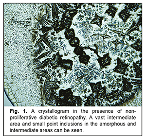 Non-invasive techniques for assessing the qualitative composition of tear, which are based on studying biochemical and immunological properties in different forms of diabetic retinopathy (DRP), are known worldwide [2, 9]; they, however, have not come into the common use in Ukraine because of the need for expensive equipment and reagents. Ukraine’s scientists have been studied native crystallography of tear, an alternative method which is quite simple to use and which is an indicator of misbalance in tear components [3, 4, 5, 7].