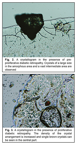 The tear was collected for crystallography from the inferior fornix conjunctiva using sterile graduated pipettes; the bio-substrate was placed into the Eppendorf tubes for no more than 2 hours. Afterwards, a drop of the bio-substrate was drawn with an insulin syringe on a clean microscope slide placed horizontally. The specimen was dried out at a temperature of 20-25ºС and relative humidity of 65-70% for 24 hours. Indices were fixed twice within 24 hours using a thermo-hygrometer TFA 45204250.  Crystallograms were studied after the time specified for obtaining a thin dry film (facies) had been expired. A microscopic crystallography examination was performed using a light microscope at a 30, 100, 200, and 800 × magnifications and a photomicrographic attachment was used to take photographs. In cases of a lack of tears and changes in tear viscosity, mainly in the patients with proliferative DRP, the lacrimal points were blocked by obturators.  In such cases, the time of collecting the specimen in one eye was up to 10 minutes.