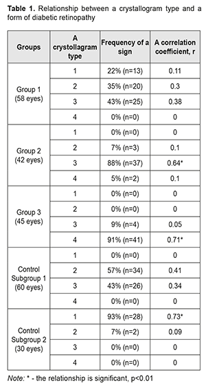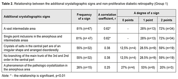 When analyzing the crystallograms, the additional crystallographic sings were noted in the study groups. Thus, in Group 1 with NPDRP, a direct relationship was noted between the presence of a vast intermediate area and small point inclusions in the amorphous and intermediate areas. Their combination with other additional crystallographic signs, which were observed in 31 eyes (53%), was not significant p<0.05 (Table 2, Fig. 1).
