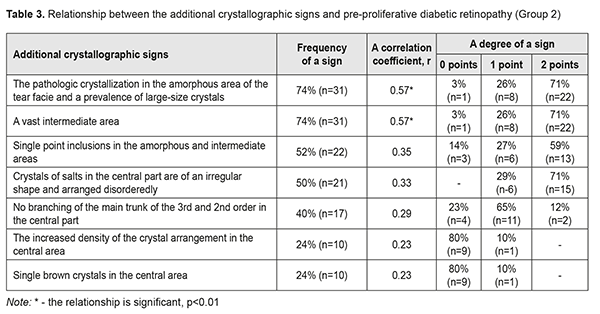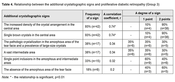 Thus, a vast intermediate area and single point inclusions in the amorphous and intermediate areas of the tear facie was noted in 81% of the NPDRP patients (р<0.01); the pathologic crystallization in the amorphous area of the tear facie and a prevalence of large-size crystals and vast intermediate areas was in 74% of the PPDRP patients (р<0.01); and the increased density of crystal arrangement and single brown crystals was in 93% of the PDRP patients (р < 0.01).