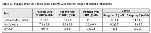 To determine the severity of dry eye syndrome (DYS) against the background of diabetes mellitus (DM), we measured: total tear secretion (Schirmer's test I); tear film stability (the Norn’s test); and lid-parallel conjunctival folds (LIPCOF) in the inferior lateral quadrant. The tests’ findings were evaluated as follows: age-appropriate normal values, the Schirmer's test  >10 mm/5 min, the Norn’s test >10s, LIPCOF=0; mild DES, the Schirmer's test  ≤10 mm/5 min, the Norn’s test ≤10s, LIPCOF=1; moderate DES, the Schirmer's test  ≤5mm/5 min, the Norn’s test ≤10s, LIPCOF=2; severe DES, the Schirmer's test  ≤2mm/5 min, the Norn’s test ≤2s, LIPCOF=3;