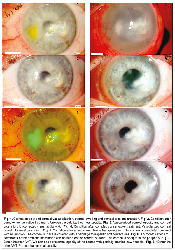 Microbiological testing of the conjunctiva discharge revealed no pathology. In addition to standard ophthalmic examinations, the patient underwent rheoophthalmography (ROG), rheoencephalography (REG), and immunogram to reveal sensitization to antigens of herpes. Pulse Volume according to the Rheographic Quotient (RQ) was decreased by 17% as compared to the fellow eye; tonic properties of the large vessels were increased by 28%, and blood flow velocity was decreased by 50%. The immunogram findings showed an increased level of lymphocytes, decreased levels of T-cells and natural killer cells. In addition, sensitization to antigens of herpes and cornea was noted. Anti-viral, etiotropic, anti-inflammatory, tear- substituting, and corneal nutrition-improving treatment made it possible to manage recurrent keratitis. The corneal surface epithelization was complete and the corneal surface was not stained by fluorescein. Visual acuity improved to 0.6 (Fig. 2). During one year and a half, till 2017, the patient received tear-substitute drugs, containing the hyaluronic acid, trehalose, and ectoin, which improved the corneal nutrition (antioxidants, vitamins, neuroprotectors). No recurrence of viral keratitis was noted. Visual acuity remained at the level of 0.5-0.6 within this period of time. In July 2017, after having an acute respiratory viral disease and severe stress, the patient’s condition deteriorated. Herpetic keratitis recurred with the presence of corneal ulceration and complicated by pain syndrome (Fig. 3). The microbiological testing of the conjunctiva discharge revealed staphylococcus epidermidis with a concentration of ˂ 10². Despite the etiotropic anti-viral and anti-inflammatory treatment, the patient’s condition improved insufficiently within 14 days. The corneal surface still had defects and active vascularization was noted in the periphery (Fig. 4). The patient was recommended a curative operation, transplantation of cryopreserved amniotic membrane using an overlay technique with AM sutured to episclera and conjunctival surface reconstruction, which was performed on July 27, 2017. After surgery, the corneal surface with AM was covered with a bandage therapeutic soft contact lens (Fig. 5). At Day 2, post-operatively, pain syndrome was managed; the patient continued the conservative etiotropic and anti-inflammatory treatment. At 1.5 Months after amniotic membrane transplantation (AMT), the amnion was partially resorbed on the corneal surface. Corneal epithelization was complete and the fluorescein test was negative. Visual acuity improved to 0.3 (Fig. 6). At 3 months after AMT, the complete resorption of the amnion and complete corneal epithelization were noted; the fluorescein test was negative. The vessels on the corneal surface were partially emptied. The Schirmer test and the Norn’s test increased to 10.0 mm to 12 s, respectively. Visual acuity improved to 0.5 (Fig. 7). Within 5 postoperative months, the patient underwent the system anti-viral and anti-inflammatory treatment and local instillations of antiseptics, recombinant human interferon, dexamethasone, vitamins, and preservative-free tear-substitute with trehalose. The immunology testing showed: improved immune reactivity of the body; increased to the normal ranges pulse blood volume (RQ); tonic properties of the small vessels decreased by 20%; blood flow velocity increased by 30%. Visual acuity was 0.5. Corneal epithelization, regressed vascularization, and decreased area of corneal opacity were noted at 12 months after AMT and a course of etiotropic anti-viral treatment. Visual acuity improved to 0.6 (Fig.8). At present, the patient is receiving tear-substitute treatment (preservative-free agents with trehalose), which improves corneal nutrition. Uncorrected visual acuity is 0.6. Discussion At the present time, treatment of herpetic ocular infection is a challenging task in ophthalmology. For treating herpetic diseases, there are numerous drugs which have etiotropic and immunocorrecting action depending on the etiology, pathology, and clinical symptoms. Antiherpetic drugs can be divided into three groups based on the mechanism of action: a chemotherapeutic agent, specific immune correctors, and non-specific immune correctors [2-6]. Antiherpetic drugs, which are used in ophthalmology as gel and ointment, are presented by acyclovir, an analogue of purine nucleoside blocking the viral DNA synthesis, and ganciclovir, a nucleoside and an analogue of guanine. One of the leading roles in the complex antiviral therapy belongs to new-generation interferon-inducing drugs (tilorone, oxodihydroacridinylacetate sodium, acridonacetic acid) which successfully combine etiotropic and immunocorrecting effects. The drugs induce the production of endogenous interferon by T and B lymphocytes, enterocytes, and hepatocytes [7]. Today, immune therapy for ophthalmic herpes includes specific (herpetic vaccine and herpetic immunoglobulin) and non-specific (interferons and interferon inductors, cytokines, micro-element vitamin complex, etc) methods. In addition, tear substitute drugs are used with the preference of preservative-free ones [8, 9]. To achieve the positive result of therapy, the duration of the complex antiviral therapy should be at least 4-6 months. All the drug groups above were used in the complex treatment for the patient described. The recurrence of herpetic keratitis and the formation of a long-lasting corneal defect require surgical treatment [10]. We draw our attention to amniotic membrane transplantation (AMT), one of the important recent techniques in ocular surface surgery [11]. Although AM was first performed in ophthalmology over 70 years ago, this is 1995 since when AMT has been widely used in patients and has shown good results [12]. Curative keratoplasty using an amnion or other long-term storage plastic materials has come into widespread acceptance [13-14]. The major indications to AMT for the reconstruction o
