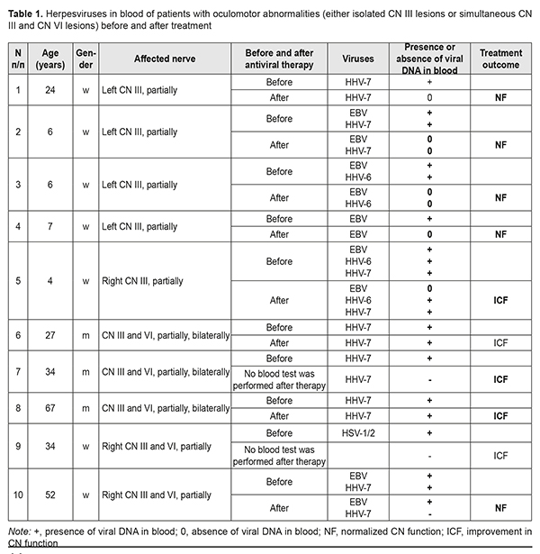 Introduction Oculomotor abnormalities (OMA) are most common in young adults of working age. In Ukraine, approximately 50 thousand children are newly diagnosed with strabismus every year. The prevalence of strabismus in children has been reported to vary from 0.5% to 3.5% across studies [1, 2]. Neuroimaging methods, brain computed tomography (CT) and magnetic resonance imaging (MRI) enabled clinicians to improve the diagnosis of central nervous system (CNS) diseases, including OMA. There is, however, a group of OMA of unknown etiology, although its share declined from 30% in nineteen sixties to 10-20% in nineteen seventies-eighties and 4-6% in nineteen nineties [3]. It is believed that a portion of cases with OMA of unknown etiology is caused by viral infections of cranial nerves (CN). The introduction of nucleic acid amplification technologies in ophthalmology made it possible to demonstrate that infection with herpes viruses is a common cause of these diseases [4, 5]. There have been reports on the molecular mechanisms of inoculation, dissemination, persistence, latency and reactivation of viruses in inflammatory processes in the ocular tissue. It has been demonstrated that human herpes virus 6 (HHV6) and other herpes viruses may cause inflammatory processes, uveitis and endophthalmitis [6]. Gonsalez-Gonsalez et al [7] found that herpes viruses accounted for 7% of all scleritis cases. Herpesviruses are transported along cranial nerves (CN). After inoculation of the cornea, viral antigen was found in ocular nerves [8]. One to three days later antigen was also found in the iris, ciliary body and choroid/sclera [9] suggesting that virus spread to these tissues occurred via their nerve supply [8]. After inoculation of the snout, virus was isolated from ophthalmic and maxillary parts of the trigeminal ganglion and the superior cervical ganglion and then from the brainstem, eye and mandibular part of the trigeminal ganglion [8]. In the hamster infection model [10], at 96 hours after conjunctival inoculation with EHV-9, encephalitis was observed in the brainstem at the level of the pons and cerebellum. The results suggested that EHV-9 invaded the brain via the trigeminal nerve in addition to the abducent (CN VI), oculomotor (CN III), and facial nerves. A feature of herpesviruses is their ability to remain latent in the body lifelong. Trigeminal ganglia are known as sites of latent infection by herpes [11]. In remission, only latency-associated transcripts were detected in the ocular tissues [11]. Although the mechanisms of reactivation of the viruses have not been identified, the presence of immunosuppressive state is believed to be an important precondition for viral reactivation [11, 12]. Replication in the cornea of reactivated virus from trigeminal ganglia produces epithelial lesions, with inflammation due to attraction of immune cells [13]. Cranial nerves are not only the pathways along which viruses are transported from one tissue to another, but are also sites of pathological changes resulting in their dysfunction [8, 14-17]. The mechanisms of viral injury to CN cells have not been fully elucidated yet; there have been, however, case reports confirming the association between cranial nerve injury and herpetic infection, with an adequate antiviral therapy resulting in improvement or complete restoration of CN function [15-17]. In spite of some advances in understanding the mechanisms of ocular infection with herpes viruses, there are only isolated studies addressing the investigation of virus-related oculomotor abnormalities. Most studies address the investigation of virus-induced inflammatory response in the ocular tissue. The purpose of the study was (1) to investigate the presence of DNA of herpes simplex virus (HSV)1/2, cytomegalovirus (CMV), Epstein Barr virus (EBV), varicella-zoster virus (VZV), human herpes virus (HHV)6, HHV7, and HHV8 in venous blood of patients with OMA related to lesions of CN III and/or VI, and (2) to generalize the data from the studies addressing the investigation of tropicity of herpes viruses and their cytopathic effect on nerve tissue. Materials and Methods Medical records of 35 patients that visited the Romodanov Neurosurgery Institute for OMA during 2016 to 2018 were subjected to analysis. Patients underwent clinical-and- neurological, and neuro-ophthalmological examination and neuroimaging studies (brain MRI or CT). No neurosurgical disorder was found in any patient. Inclusion criteria were the presence of CN III and/or CN VI lesions, and absence of neurosurgical or endocrine disorders or autoimmune processes. Whole venous blood samples were collected for detection of HSV1/2, CMV, EBV, HHV6, HHV7, VZV, and HHV8 DNA using polymerase chain reaction (PCR). An Ampliprime DNK-sorb kit was used to isolate DNA from blood samples. A classic PCR was performed using a GenPak PCR-core kit (Isogene, Russia). The reagents used were agarose (Amresco, Solon, OH, USA), Trilon B (Riedel-de Haën AG, Seelze, Germany), Tris (Amresco), and ethidium bromide (Sigma). PCR amplification was performed in a Tertsik PCR system (DNK Tekhnologiya), and 2% agarose gel electrophoresis and ViTran software were used to visualize PCR amplification products. Fischer’s exact test was used to assess the significance of the difference in sign frequency among comparison groups. The study protocol was approved by the Ethics Committee of the Romodanov Neurosurgery Institute. Results and Discussion The most common presenting complaint was diplopia (33 patients; 94.3%). In addition, patients complained of cosmetic concerns with regards to convergent strabismus (23 patients; 65.7%), divergent strabismus (8 patients; 22.95%), and ptosis (6 patients; 17.1%). Two (5.7 %) patients had ptosis without diplopia. The study cohort included 20 (57.14%) women and 15 (42.86%) men. The patients’ age ranged from 4 to 67 years (mean age, 31.2±14.4 years), i.e., the bulk of patients were adults of working 