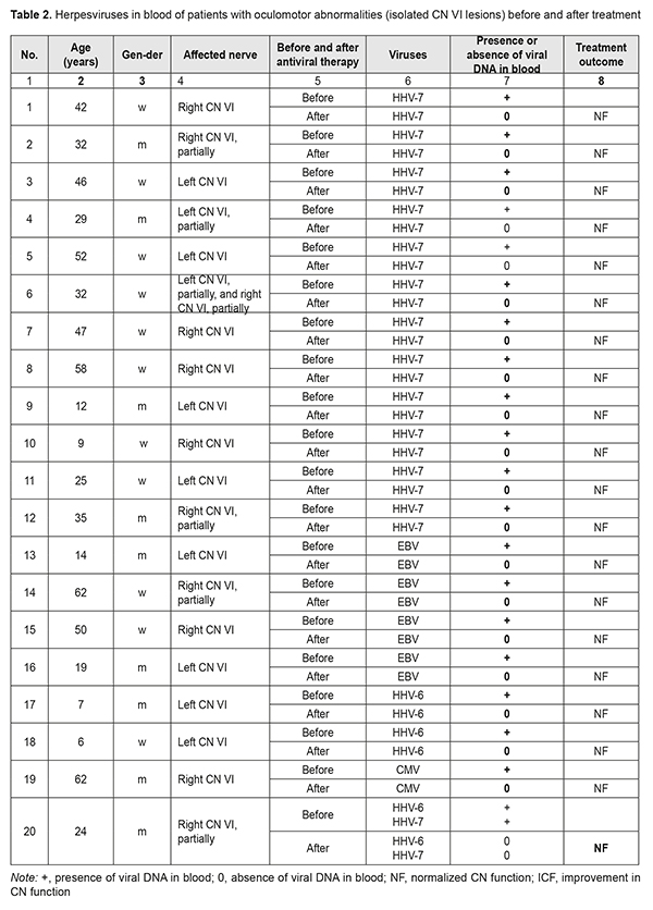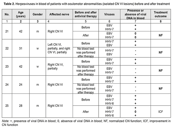 Isolated abnormalities in the function of CN VI were found in 25 patients (13 and 10 had right-side and left-side abnormalities, respectively, and 2 had partial bilateral neuropathy). In these patients, abnormalities varied from paralytic convergent strabismus and absence of ocular motility to partial ocular motility defect (restricted lateral gaze). In addition, of these patients, 3 were children (girls aged 6 and 9 years and a boy aged 12 years), and they had complete CN VI dysfunction. Of the patients with abnormalities in the function of CN VI, 12, 2, 4, 1, 4, 1, and 1 had HHV7 only; HHV6 only; EBV only; CMV only; HHV7 and EBV; HHV6 and HHV7; and HHV7, HHV6, and EBV, respectively (Table 2).