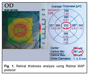 Introduction Preterm delivery may lead to neonatal complications including those related to the eye. Retinopathy of prematurity (ROP) is a severe vasoprolliferative retinal disorder that may cause blindness or visual impairment [1]. Immature ocular optics at birth and severe ROP may affect normal development of the retina, and lead to late impairment of visual functions [2]. Optical coherence tomography (OCT) is a commonly used objective non-contact imaging technology for examination of the retina. Of the methods used for diagnosis of retinal pathological conditions, it provides one of the greatest amounts of valuable information. In addition, it produces images approaching the resolution of histology [3]. The absence of tissue contact during OCT session and short-time scanning process make it possible to employ the method in children of 3 years and older [4]. The purpose of the study was to compare spectral-domain optical coherence tomography (SD OCT) retinal thicknesses in the macular area between preterm children who received laser photocoagulation of avascular retina for severe ROP and full-term children aged 4-6 years. Materials and Methods Twenty-five premature children (50 eyes) and 38 full-term children (69 eyes) aged 4-6 years received outpatient observation care at the Filatov institute between 2011 and 2017. The inclusion criterion for premature children was severe ROP (subthreshold ROP, type 1 or threshold ROP) diagnosed during screening. The children diagnosed with severe ROP underwent laser photocoagulation of avascular retina before the age of 3 months. Patients with grade 4 or 5 ROP or other ocular pathology (history of cataract, glaucoma, trauma or eye surgery) were excluded. Premature patients were compared with 38 conventionally healthy full-term age-matched controls (69 eyes). Inclusion criteria for full-term children were normal weight at birth and absence of ocular pathology. Mean gestation age at birth and mean weight at birth of the included premature children (15 boys and 10 girls) were 1407 ± 753 g and 30 ± 3.5 weeks, respectively. The Spectralis™ platform (Heidelberg Engineering GmbH, Heidelberg, Germany; imaging speed, 40,000 A-scans/s; optical resolution, 7.5 μm; axial digital resolution, 3.5 μm) was used for retinal SD OCT imaging. If the data followed normal distribution, ANOVA was used for statistical analyses (Scheffe test was used for paired comparisons). Otherwise, a Kruskal-Wallis test, followed by a Dunn’s test, was performed. Microsoft Excel was used for statistical analyses. Results Mean SD OCT retinal thicknesses in all macular quadrants in the group of patients who received laser treatment were significantly greater (p < 0.05) than in controls (Table 1). Therefore, there were statistically significant differences in retinal macular thickness between premature and full-term children (Fig. 1).