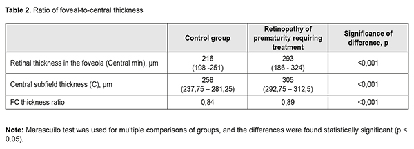 There were statistical significant differences in FC thickness ratio among premature and full-term children (Table 2). Of the 25 premature children (50 eyes), 18 (36 eyes; 72%) and 7 (14 eyes; 28%) had an increase in the FC thickness ratio of ≥ 0.1 and < 0.1, respectively, compared to controls.