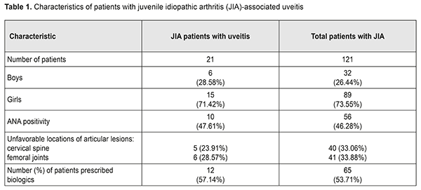 Introduction Juvenile idiopathic arthritis (JIA) is the most common rheumatic disease of childhood, with JIA-associated uveitis (JIA-U) its most frequent extra-articular manifestation [1, 2]. Pediatric uveitis is a topic of special interest not only because of the unique diagnostic and therapeutic challenges but also because of the lifetime burden of vision loss if the problem is not adequately treated, as well as the economic and psychological toll on the family and society as a whole [3]. Uveitis is the fourth most common cause of blindness in developed countries [4]. The causes of uveitis are numerous (approximately 50), and include HLA-B27 positivity, tubulointerstitial nephritis, Behçet’s disease, sarcoidosis, and viral, parasitic and bacterial factors [5, 6]. Smith et al [7] found that idiopathic uveitis, JIA-U, and pars planitis were the leading diagnoses in pediatric uveitis. JIA-associated uveitis accounts for 20% to 25% [7, 8] and even as much as 39.4% [9] of cases with pediatric uveitis. Major risk factors for the development of uveitis in JIA are oligoarticular pattern of arthritis, an age at onset of arthritis of less than seven years of age, and antinuclear antibody (ANA) positivity [8, 10]. It has been found that uveitis appeared simultaneous with or within the first 6 months of arthritis onset in almost half (48%) of cases of JIA [11]. Approximately 12% to 38% of patients with JIA develop uveitis in seven years following onset of arthritis [8, 12]. In the initial stages of mild to moderate inflammation, uveitis is not timely diagnosed [8]. However, the underlying pathogenic mechanisms remain unclear, particularly regarding interplay between genetic and environmental factors. Work is in progress on updating novel (a) risk markers for pediatric inflammatory uveitis and severe disease course, (b) approaches to the treatment of resistant disease, and (c) criteria for the measurement of imaging endpoints and assessment of therapy efficacy. There are several new genetic markers, biomarkers and clinical factors that may influence a child’s uveitis disease course [13]. In a large cohort of patients with JIA [11], anterior uveitis was the most common anatomic type of uveitis (83%), whereas intermediate uveitis (9%), posterior uveitis (1%) and pan-uveitis (7%) were less frequent.. In a study by Cosickic et al [12], 78% of children with JIA-U had bilateral uveitis. This condition is usually asymptomatic [10, 12, 14], and thus screening for JIA-U in at-risk patients is paramount. Early detection and treatment aims to stop inflammation and prevent the development of complications leading to visual loss. Complications of JIA-U include cataracts, glaucoma, optic disc edema, retinal detachment, epiretinal membranes, amblyopia, linear keratopathy, hypotony, etc [10, 15-17]. In 30% to 50% of children with JIA-associated uveitis structural complications are present at diagnosis. Of these, about 50% to 78% will eventually complications [8, 9, 18, 19]. Uveitis treatment strategies for patients with JIA are still widely discussed. Glucocorticosteroids are probably the most widespread treatment, but, since they have substantial side effects and low efficacy in achieving disease remission, resorting to immunosuppressive treatments is a frequent practice [3, 4]. There is an increasing amount of evidence supporting early use of immunosuppressive treatments to reduce the use of topical and systemic glucocorticosteroids. Findings of some studies suggest that although giving oral GCS in sufficiently low doses (i.e., ≤7.5 mg/day) for long periods is safe, it is of low efficacy; therefore, immunosuppressive agents should be used as a part of early treatment for uveitis [5]. This includes disease-modifying antirheumatic drug (DMARD) therapy (principally methotrexate) and biological agents targeted at particular cytokines (most commonly, monoclonal antibodies targeted against TNF-α). Adalimumab is used in the management of non-infectious, intermediate, posterior and pan-uveitis uveitides and considered more efficacious than other biological agents [5, 20]. A study on the analysis from the UK Childhood Arthritis Prospective Study (CAPS) [21] has reported that the percentage of patients prescribed biologics for JIA increased to 16%-38%. Evidence has been reported [20, 22, 23] supporting the use of biologics (in particular, adalimumab) in patients with early onset, chronic anterior uveitis, which was in most cases associated with JIA, in case of inadequate response to topical therapy and methotrexate, with improved long-term control of disease. In addition, the incidence of visual impairment and ocular complications was lower and improvement was observed earlier than in other studies [16, 22], and special attention was given to long-term treatment outcomes. The SITE study [19] has concluded that increasing uveitis activity was associated with increased risk of vision loss and use of immunosuppressive drugs was associated with reduced risk of vision loss suggesting that control of inflammation and use of immunosuppression may be critical aspects in improving the outcomes of patients with JIA-related uveitis. Severe intraocular inflammation, chronicity of uveitis at a young age, late first visit to an ophthalmologist, ocular complications, and posterior uveitis are among the factors causing blindness in children with uveitis [15]. That is why observation of patients with JIA-associated uveitis should be guided by the current Single Hub and Access point for pediatric rheumatology in Europe (SHARE) consensus-based recommendations for diagnosis, screening, disease activity measurement, and treatment [24]. The purpose of the study was to investigate the features of the clinical course of and the state of eye care for patients with JIA-associated uveitis based on the data from the Pediatric and Adolescent Health Institute of the NAMS of Ukraine. Materials and Methods We analyzed the results of monitoring 1