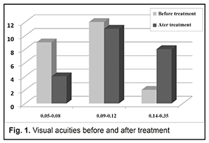 Introduction The population prevalence of macular holes is estimated to be 0.05%. The prevalence of idiopathic macular holes in individuals above 60 years is up to 0.3%, with a female-to male ratio varying from 1.8 to 1 to 3 to 1 [1, 2]. Gass has proposed a four-stage system of identifying idiopathic macular holes [3]. Stage 1A: Foveal detachment. Macular cyst. Tangential vitreous traction results in the elevation of the fovea marked by increased clinical prominence of xanthophyll pigment. This stage is occasionally referred to as the yellow dot stage. Stage 1B: As the foveal retina elevates to the level of the perifoveal, the yellow spot of xanthophyll pigment changes to a yellow ring. Persistent traction on the fovea leads to dehiscence of deeper retinal layers at the umbo. Stage 2: This is the first stage when a full-thickness break in the retina exists. It is defined as a full-thickness macular hole less than 400 µm in size. The full-thickness defect may appear eccentric, and there may be a pseudo-operculum at this stage. These opercula have been examined and found to be vitreous condensation and glial proliferation without harboring any retinal tissue. Stage 3: A full-thickness macular hole in the retina exists. It is greater than 400 µm in size and is still with partial vitreomacular traction. Stage 4: A full-thickness macular hole exists in the presence of a complete separation of the vitreous from the macula and the optic disc. There is recent evidence, however, that, even in the presence of an apparent posterior vitreous detachment, a thin shell of residual cortical vitreous may still remain and contribute to the macular hole. Surgical macular hole repair without internal limiting membrane (ILM) peeling was first reported in 1991, with macular reattachment achieved in 58% and an improvement in visual acuity of two lines or better attained in 42% of eyes [4]. Current macular hole repair techniques with the use of short acting gases for tamponade allows achieving a rate of hole closure of almost 100% for stage 2 [1, 5] and 69% for stage 3 or 4 macular holes [6, 7]. In addition, a hole rate closure for macular holes > 600-800 μm in diameter varies from 50 to 87% [8, 9]. In the inverted ILM flap technique, an ILM remnant attached to the margins of the macular hole is left in place and then inverted upside-down to cover the macular hole. This technique has demonstrated an improved hole closure rate for large macular holes [10, 11]. The surgical approach based on the formation of retinal detachment in the posterior pole with creation of additional radial breaks in order to relax the retina is rather traumatic [12, 13]. Therefore, there is a need for new approaches to treatment of macular holes. The purpose of the study was to assess the efficacy of the 20% C3F8/air mixture in the vitrectomy surgery for macular holes > 800 μm in diameter. Materials and Methods Twenty two patients (14 women and 8 men; mean age, 69.6 SD (14.3) years) with a macular hole diameter ranging from 800 to 1,470 μm were involved in the study. OCT-based assessment of macular hole size was performed taking into account the maximum area of free RPE. The duration of the macular hole exceeded 6 months in all affected eyes. At baseline, visual acuity ranged from 0.04 to 0.23, 5 eyes had dry age-related macular degeneration, 14 eyes were phakic and 8 eyes were pseudophakic. A routine three-port approach was used to perform the intravitreal procedure with a 25+ Alcon CONSTELLATION® vitreous cutter (Alcon, Fort Worth, TX). First, vitrectomy with stripping of the posterior hyaloid to the equator was performed. The vitreous was stained with Brilliant Peel® Dual Dye, if required. The same dye was then used to stain the ILM. The ILM was peeled to half a distance between the outer optic disc margin and the foveola. Thereafter, injection of sterile air into the vitreous cavity was performed with simultaneous aspiration of the aqueous humor from the bed of the macular hole for at least 5 minutes. Finally, vitreous tamponade with the 20% C3F8/air mixture was performed. Routine variational statistics methods were used. Chi-square analysis (χ2) was used to assess nonparametric data. Results and Discussion No intraoperative complications were observed. In the early post-operative period, no complications were observed, and the percentage of gas in the vitreous was at least 75%. Patients maintained face-down position for 10-12 days after surgery. At 2 months after gas resorption, the hole was completely closed in 20 (90.9%) of the 22 patients. In addition, diameter of the hole dropped from 1,100 μm to 150 μm in one eye, and the hole did not close in another eye. Visual acuity improved significantly (χ2 = 13.15, p = 0.001) to 0.08-0.35. In 3 eyes, 12 eyes and 7 eyes, visual acuity improved to 0.05 – 0.08, 0.09 – 0.12, and 0.14 – 0.35, respectively. Visual acuities before and after treatment are represented in Fig. 1.