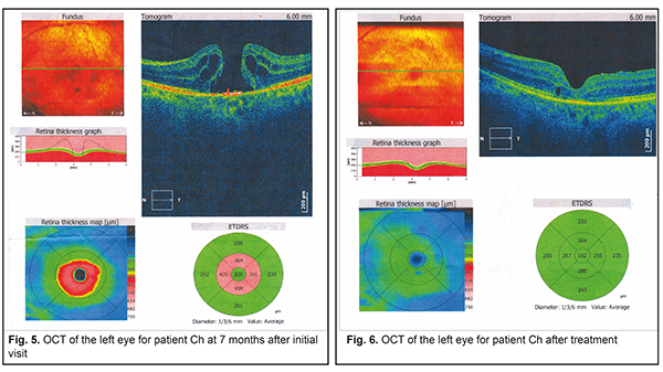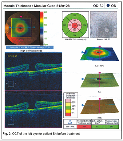 ILM removal results in retinal tissue relaxation and filling the site of bare RPE (the major mechanism of macular hole closure). It is known that the longer the time the macular hole is in contact with the gas bubble only, the higher is the chance for macular hole closure [5, 14]. The importance of adequate tamponade of macular hole edges has been confirmed in the study by Shimada et al [15] who determined adherence to face-down positioning (FDP) among patients who underwent vitrectomy and gas tamponade for macular hole (MH) repair. Nurses recorded whether the patient complied with FDP each time they examined the patient. FDP score was obtained from the nursing records; patients were given a score of 1 if they complied with the FDP and 0 if they did not. The score was recorded four times per day for the first 3 postoperative days. A perfect FDP score was 12. The closure rate in patients with FDP score <7 was significantly lower than in patients with an FDP score >7 [15]. In the current study, the use of the 20% C3F8/air mixture enabled a long lasting tamponade of the macular hole, with a hole closure rate of 91%. Our previous experience has demonstrated that, with the C3F8 of such concentration used in gas-air mixture, the percentage of vitreous cavity gas fill was greater than 50% for at least 3 postoperative weeks, and, if the patient poorly adhered to the face-down positioning after macular hole surgery, the volume of the gas bubble remained large enough to make an effective tamponade of the macula, which is an essential advantage of this approach. Studies have been reported on vitrectomy for large diameter macular holes, but most of them are related to functional and anatomic outcomes of vitrectomy for macular holes with a diameter greater than 400 μm [1, 16]. Yamashita et al [17] reported on the efficacy of surgery for macular holes with a diameter greater than 550 μm. Wong et al [13] reported the outcomes of vitrectomy for macular holes with a diameter of at least 650 μm. Because the current study involved 22 patients who underwent surgery for macular holes with a diameter greater than 800 μm, it is rather difficult to compare this study with other reports evaluating treatment outcomes of vitrectomy for large macular holes. Most of the studies compare the inverted ILM flap technique with the classic macular hole surgery with regard to efficacy. Michalewska et al [10] and Mahalingam and Sambhav [11] found the former to be more efficacious, but Kannan et al [18] found no significant difference between the two approaches with regard to closure rate for macular holes with a diameter greater than 600 μm. A number of studies involved patients that underwent of vitrectomy for macular holes of different diameters (including large diameters), and compared different tamponade agents with regard to treatment outcomes. No significant difference in closure rate for large diameter macular holes or for stage 3 or 4 macular holes has been found between sulfur hexafluoride (SF6) or perfluoropropane (C3F8) tamponade groups [14,19]. Kim et al [20], however, have found macular hole surgery with the 15% C3F8/air mixture to be more beneficial than that with the 20% SF6/air mixture with regard to visual outcomes. Rao et al [21] have reported the efficacy and safety of outpatient fluid-gas exchange with 15% C3F8 or 20% SF6 for open macular hole after primary vitrectomy. They found that of the 36 eyes, 32 (89%) achieved anatomic success. In addition, the success rate for macular hole surgery has been found to depend on the duration of intraocular gas tamponade [22]. Therefore, the current study demonstrated a high efficacy of the 20% C3F8/air mixture in the treatment of macular holes > 800 μm in diameter. These findings indicate that the approach has the potential for wide use in clinical practice. Example cases A 75-year-old woman with a 850-μm diameter macular hole and visual acuity of 0.07 in her left eye (OCT, Fig. 2) underwent vitrectomy with ILM peeling and tamponade with the 20% C3F8/air mixture. The macular hole was found to be closed, and visual acuity improved to 0.17 (Fig. 3) at 2 months after surgery.